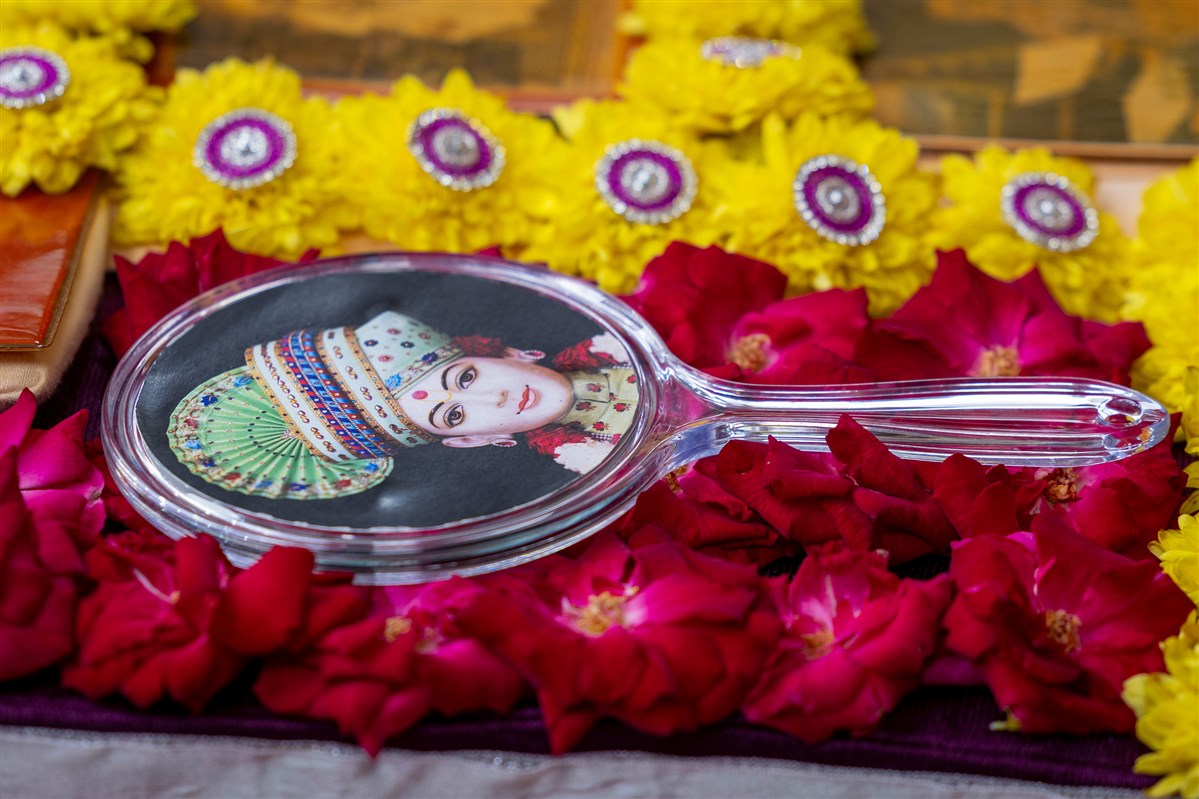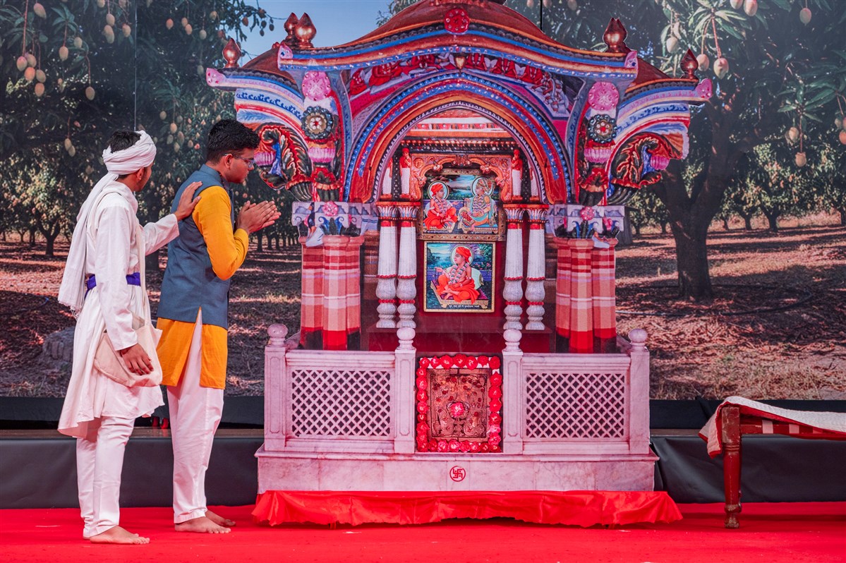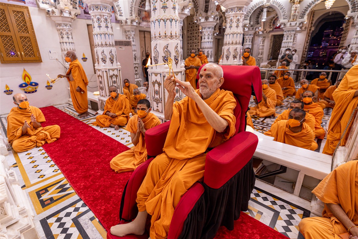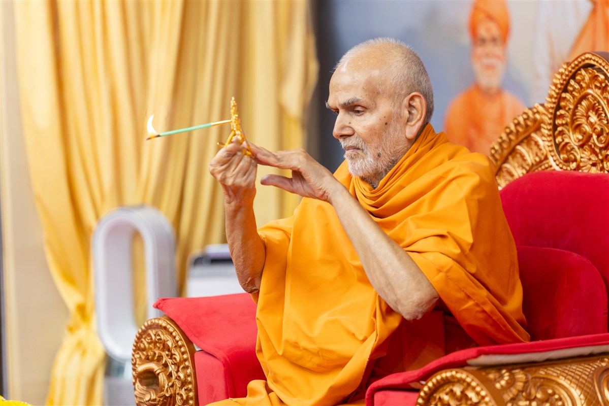 Swamishri offers thal to Shri Akshar-Purushottam Maharaj