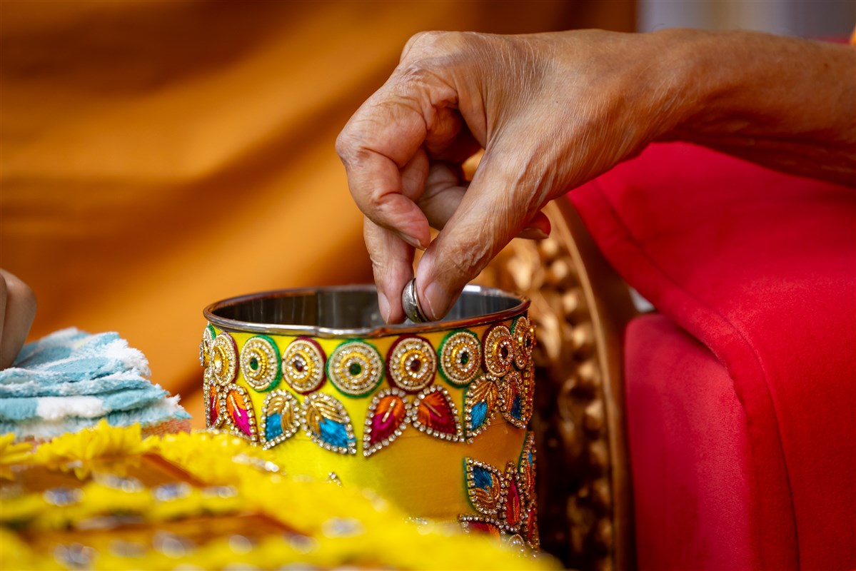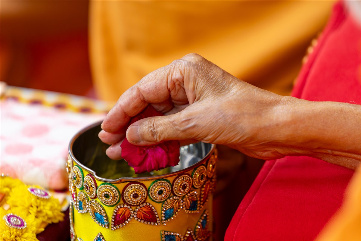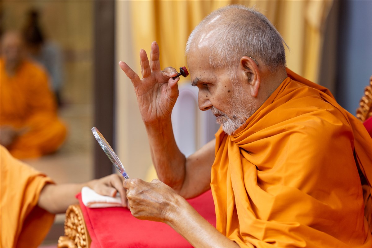 Swamishri sanctifies water with the holy relics of Bhagwan Swaminarayan and the Guru Parampara