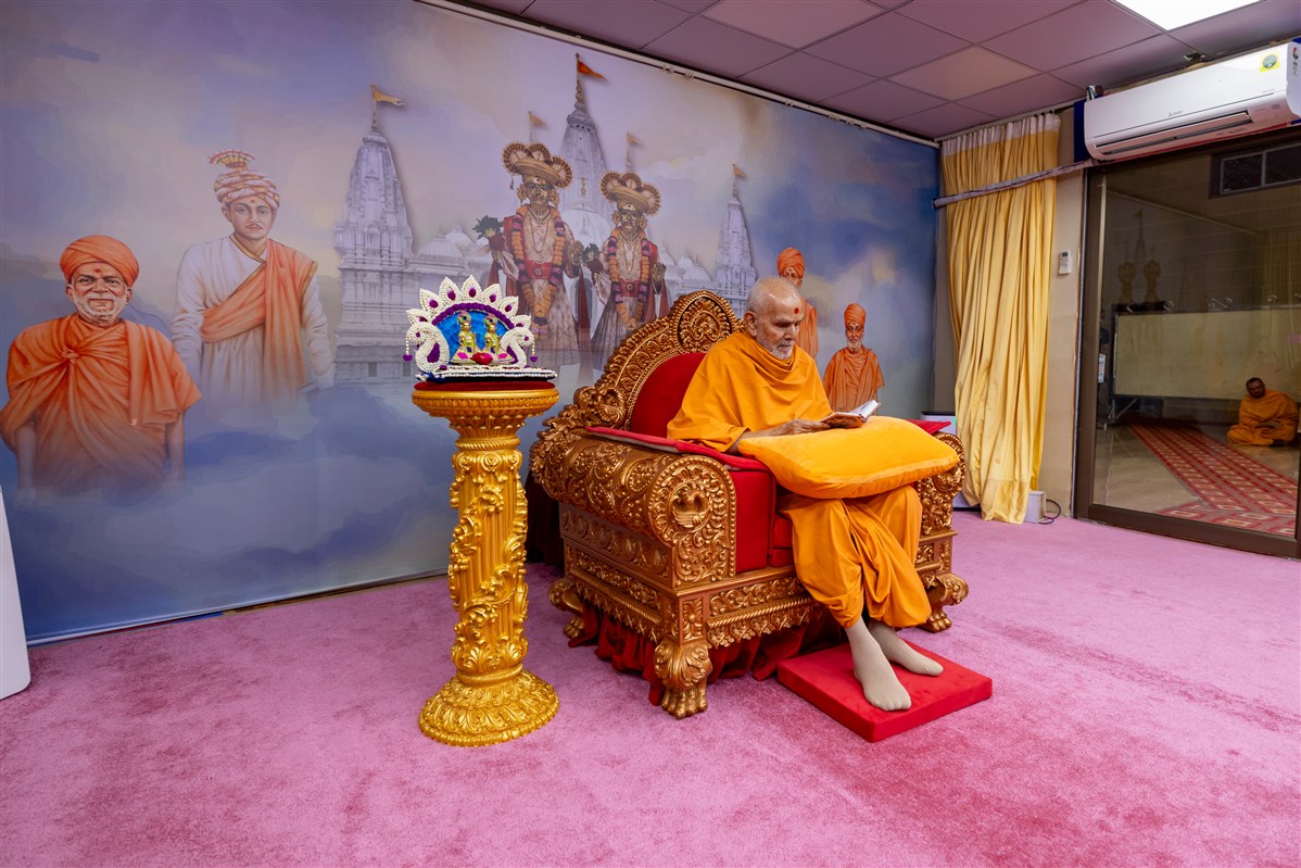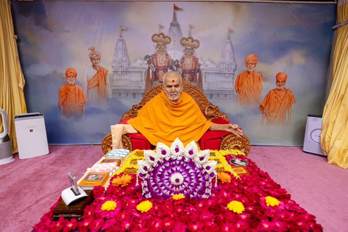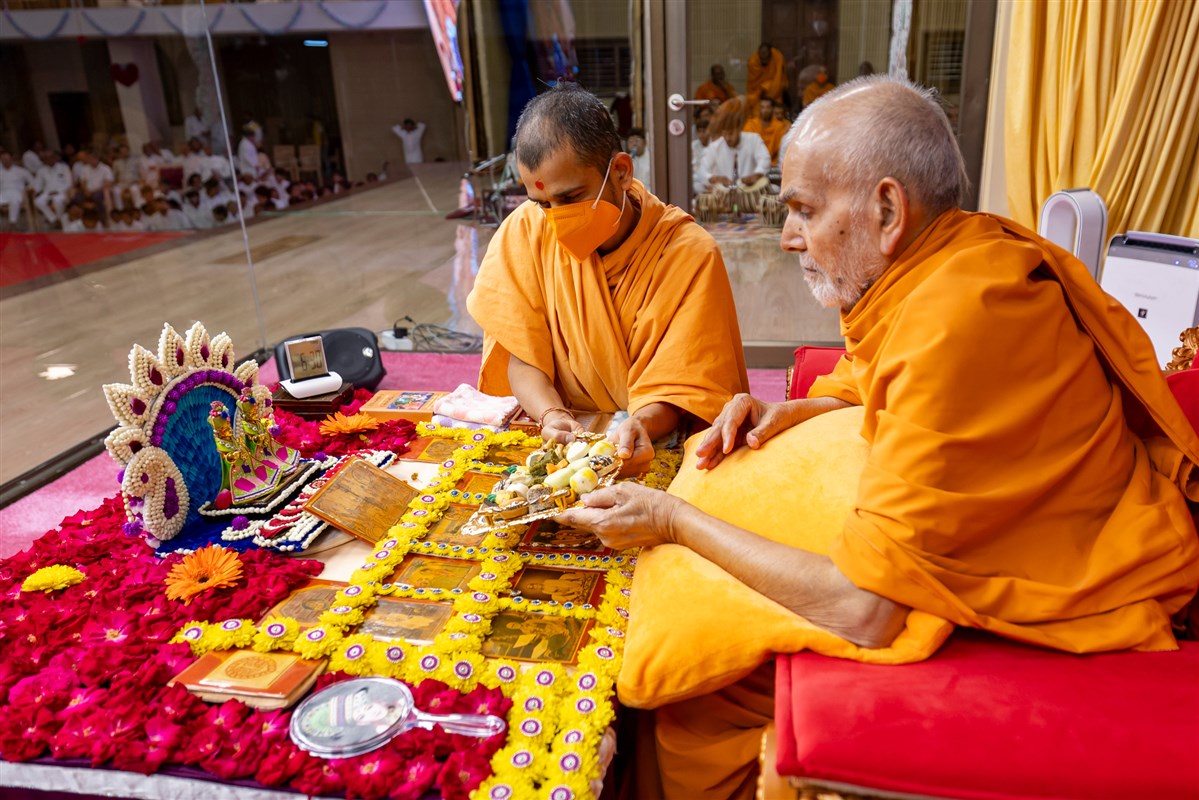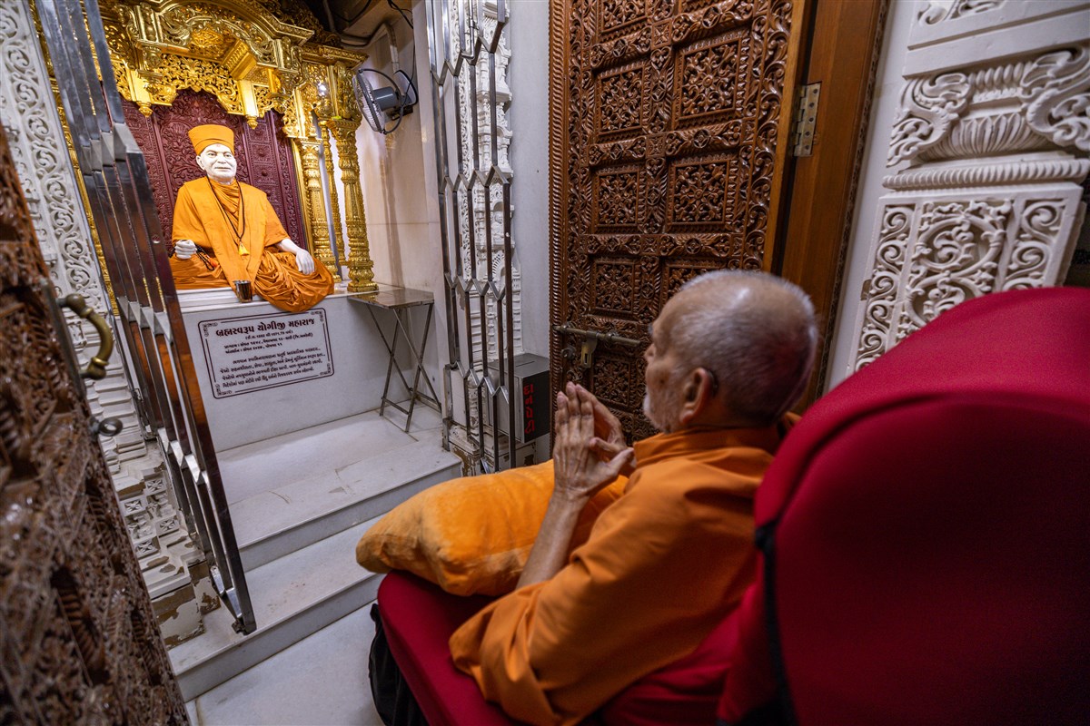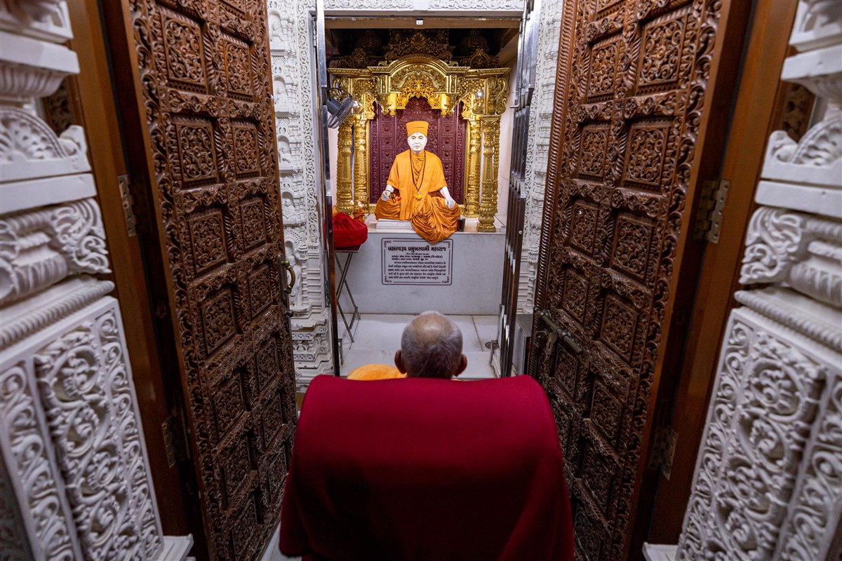 Swamishri engrossed in darshan of Shri Harikrishna Maharaj and Shri Gunatitanand Swami Maharaj