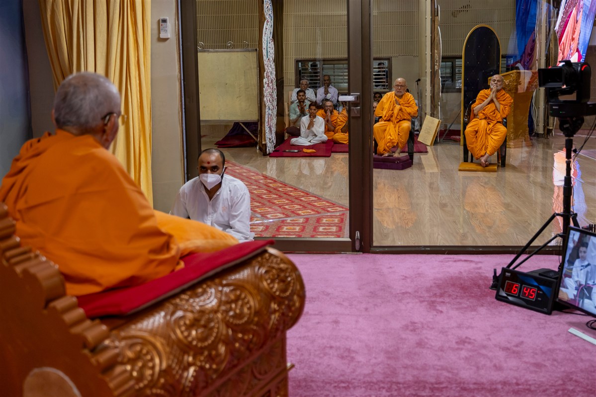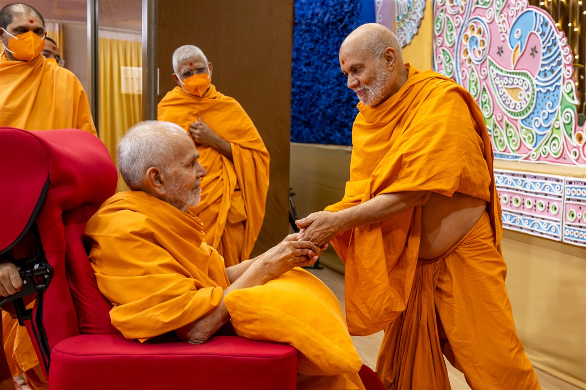 Pujya Ghanshyamcharan Swami greets Swamishri