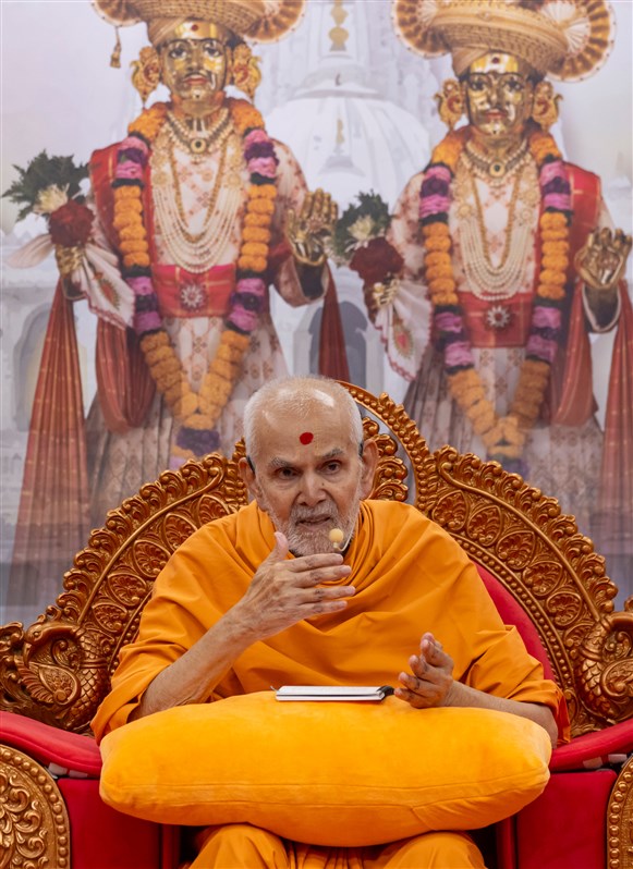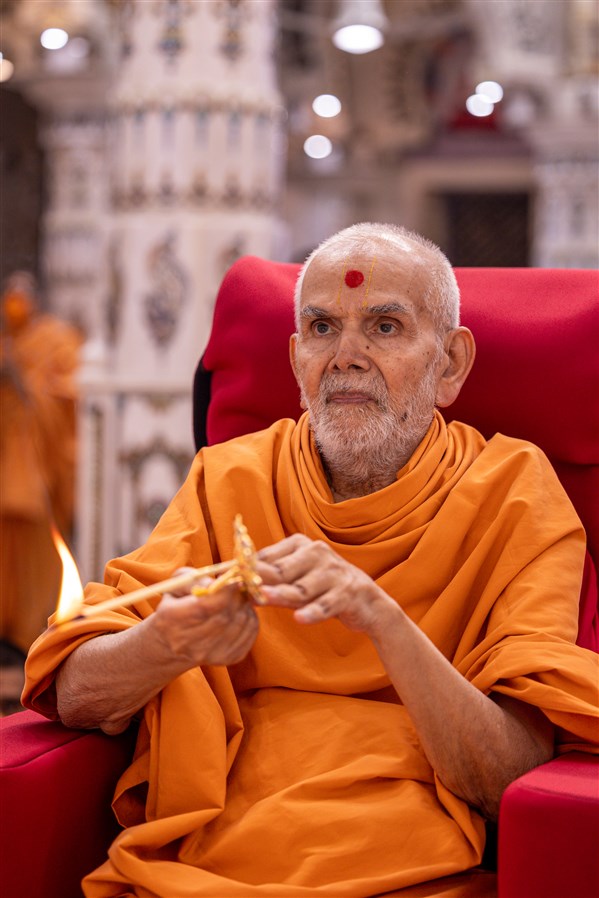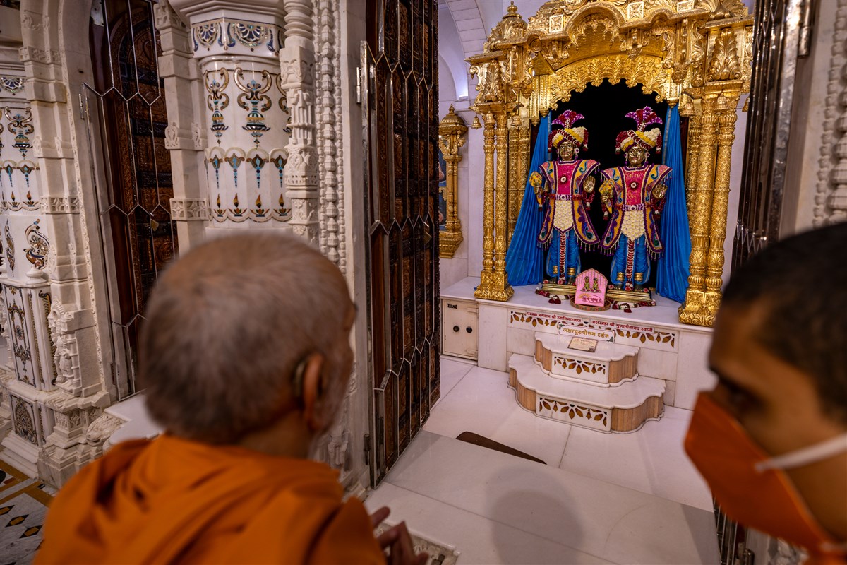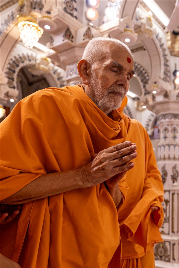 Swamishri engrossed in darshan of Bhagwan Swaminarayan and Aksharbrahma Gunatitanand Swami