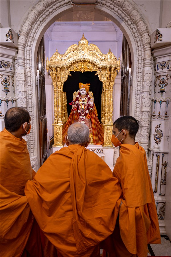 Swamishri engrossed in darshan of Shri Ghanshyam Maharaj