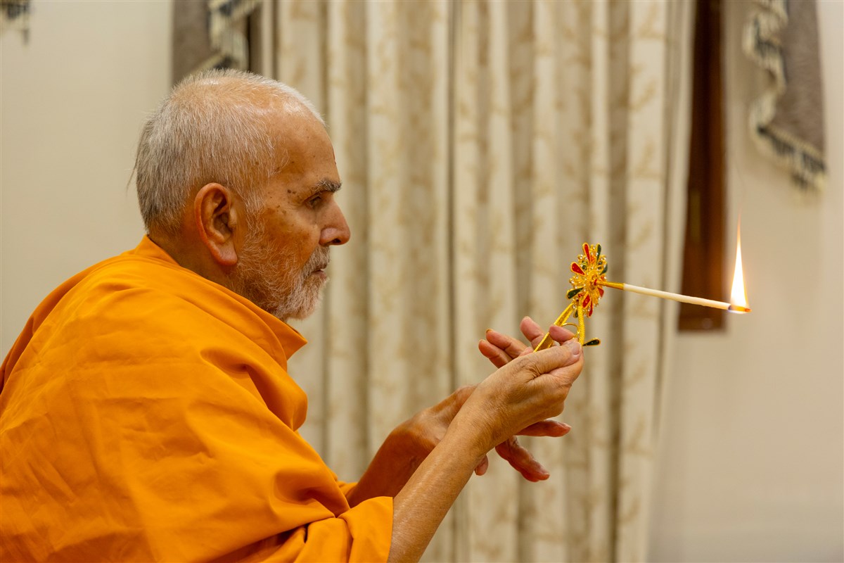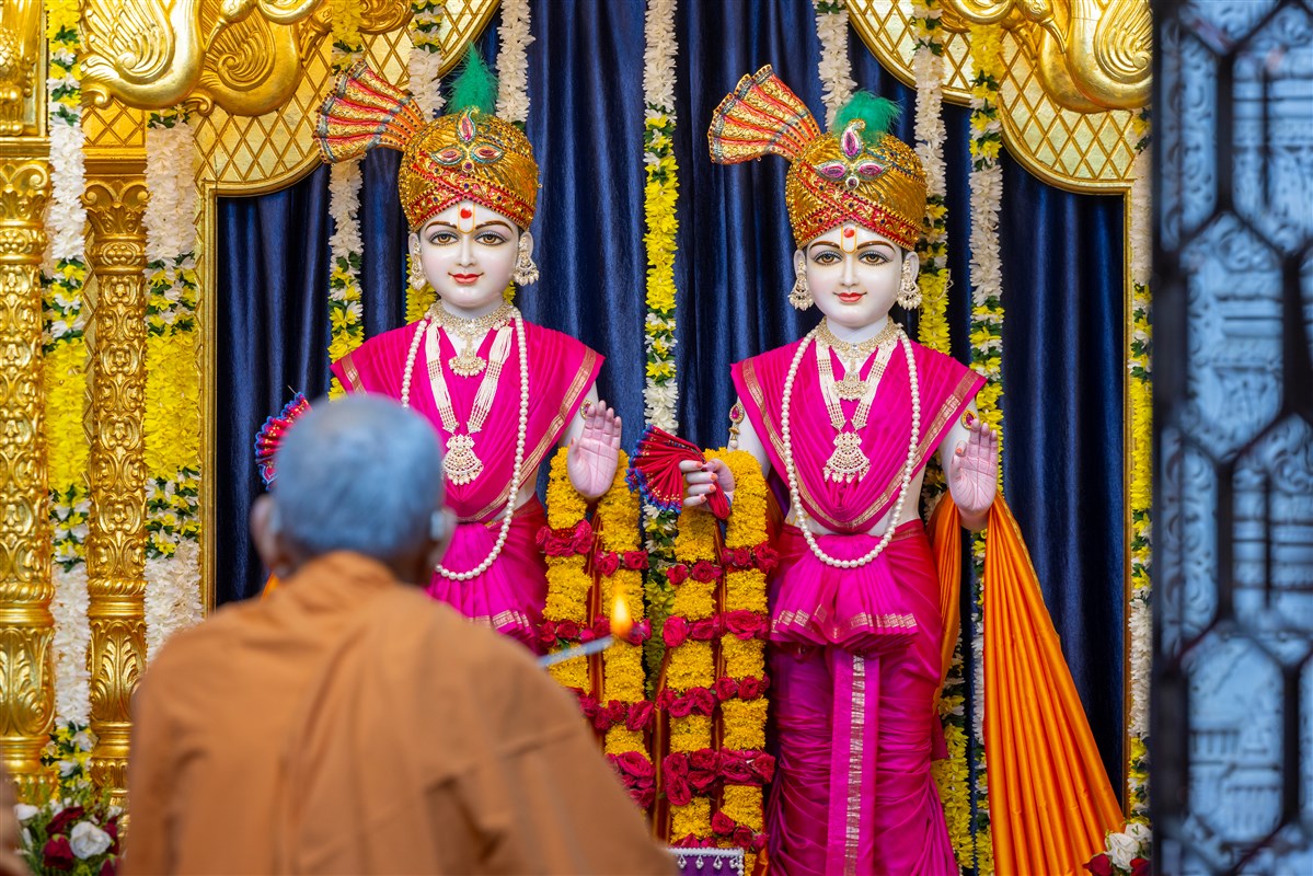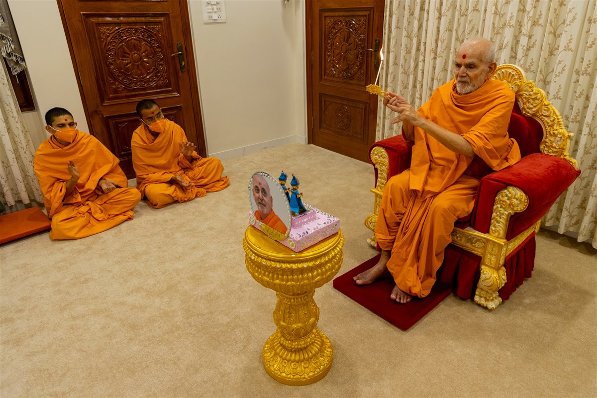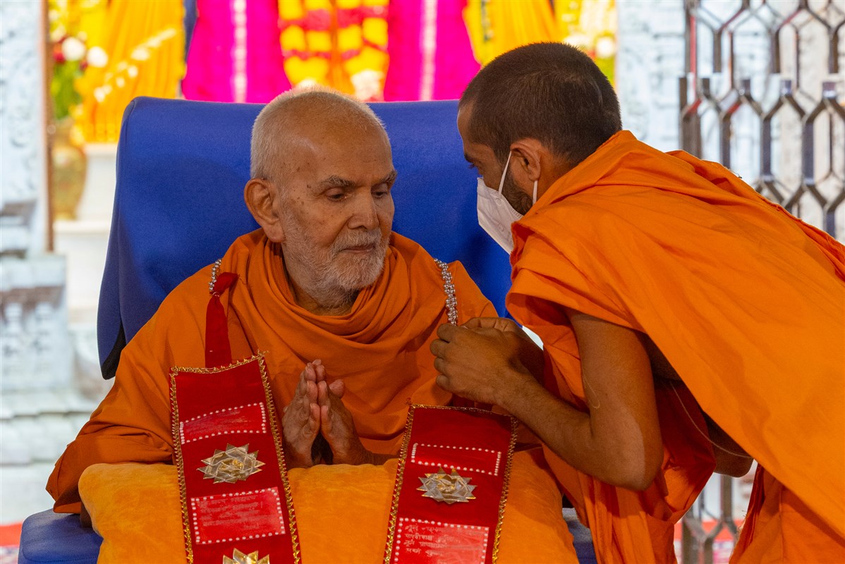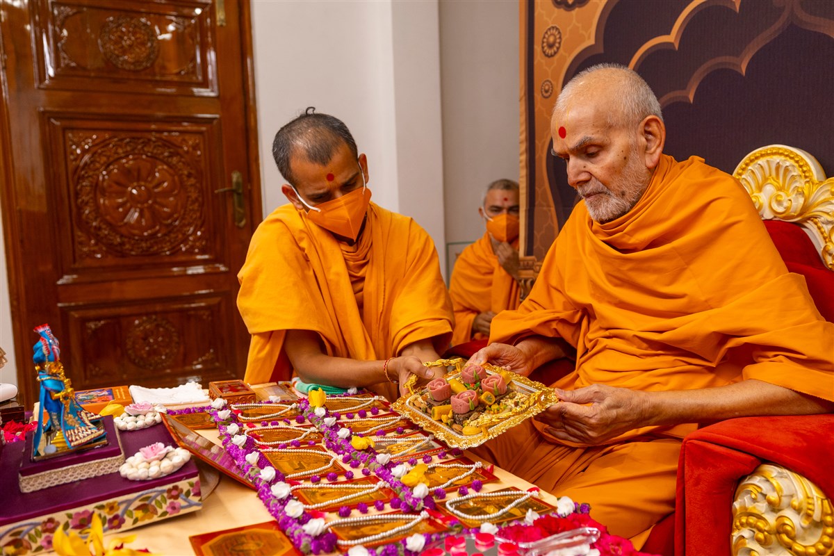 Swamishri offers thal to Brahmaswarup Pramukh Swami Maharaj
