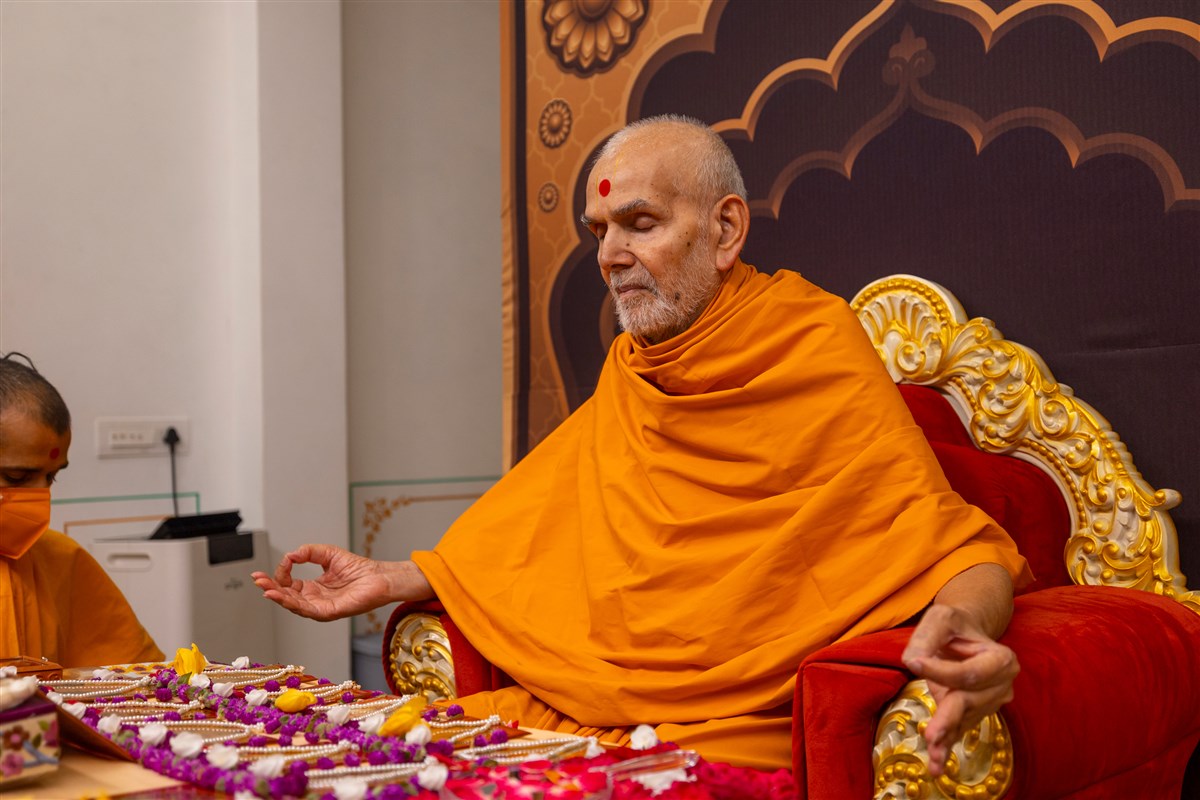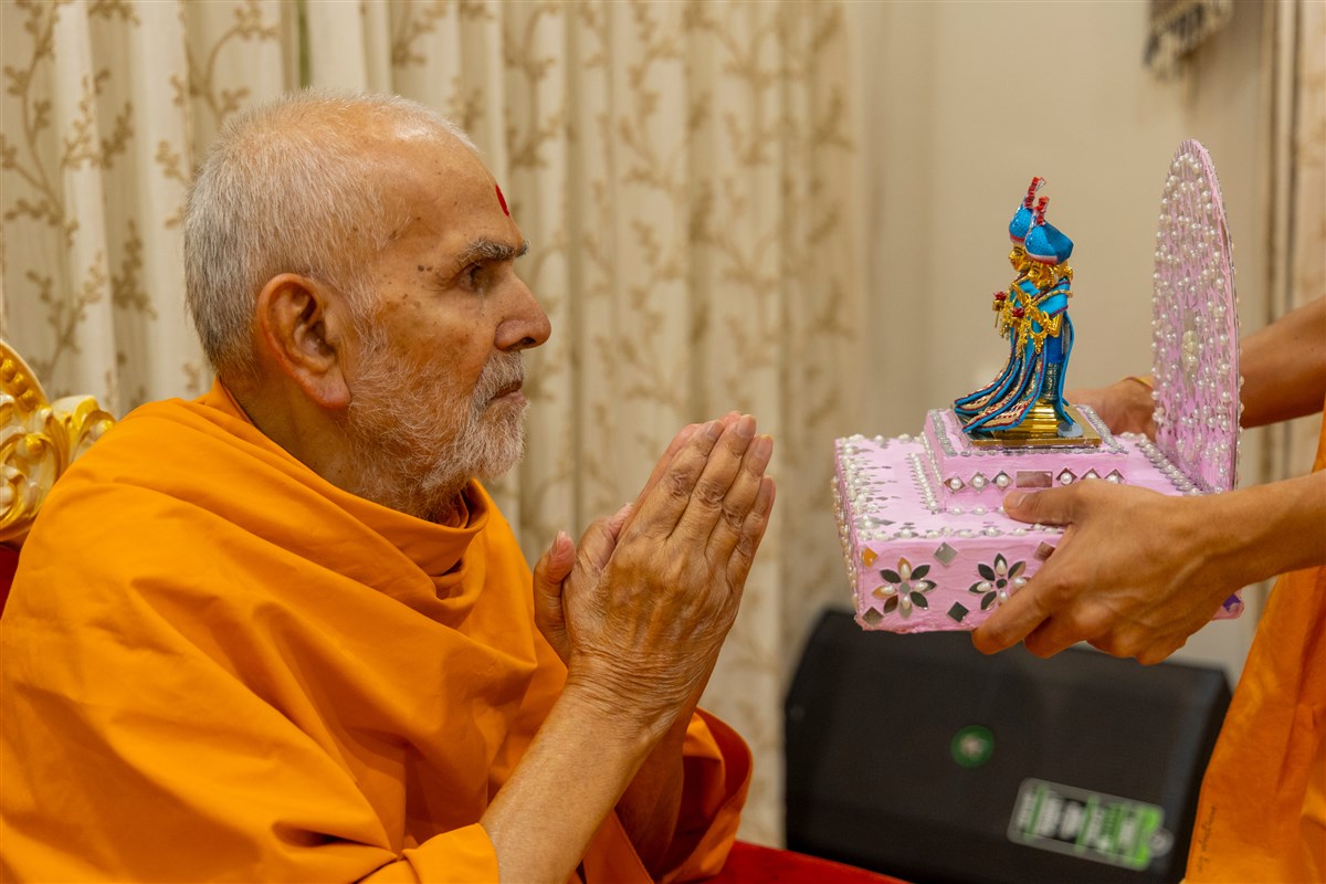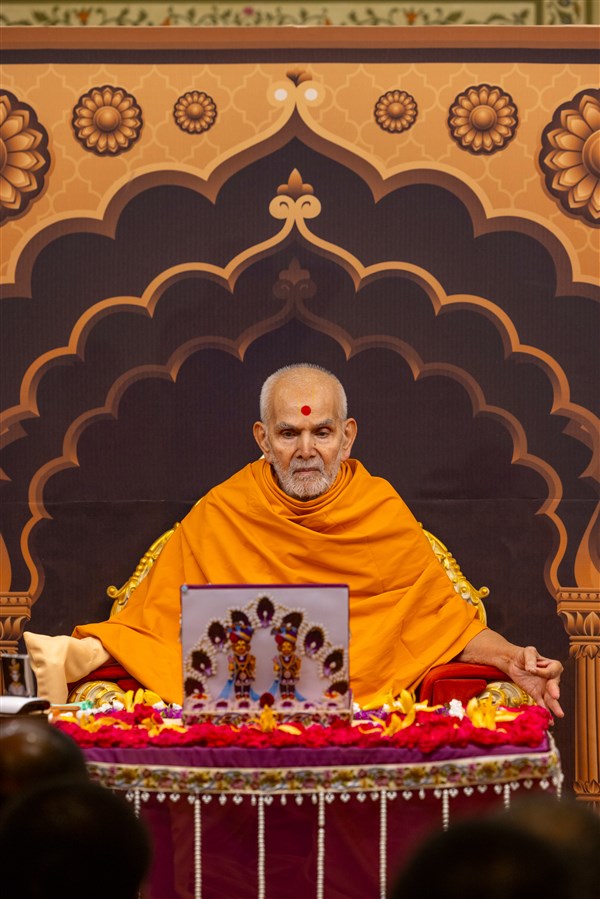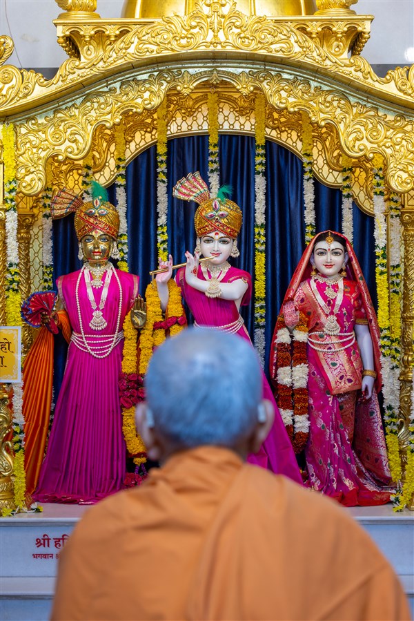 Swamishri engrossed in darshan of Shri Harikrishna Maharaj, Bhagwan Shri Govind Devji and Shri Radhaji