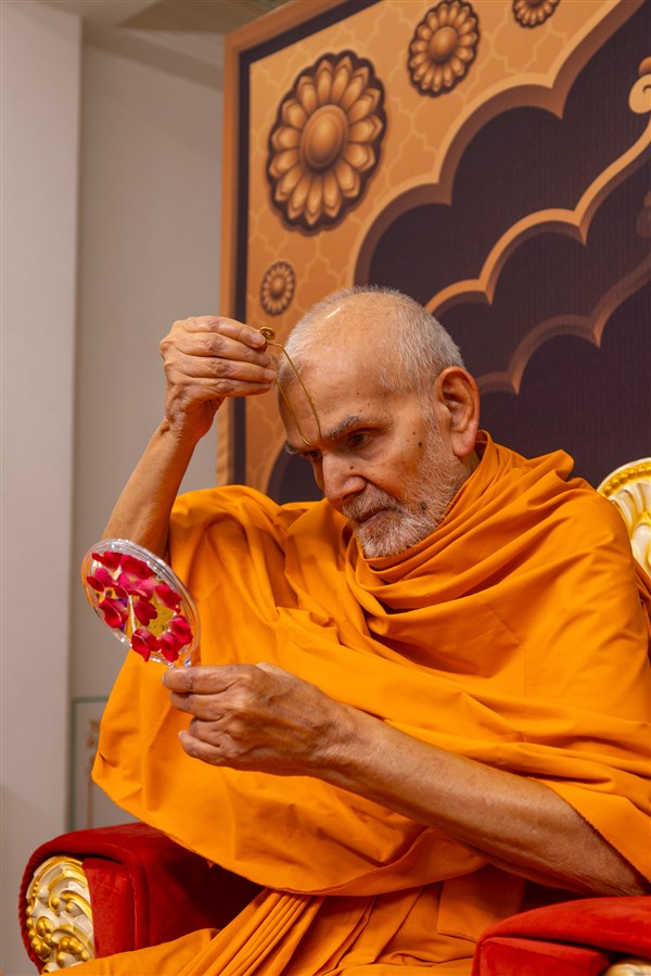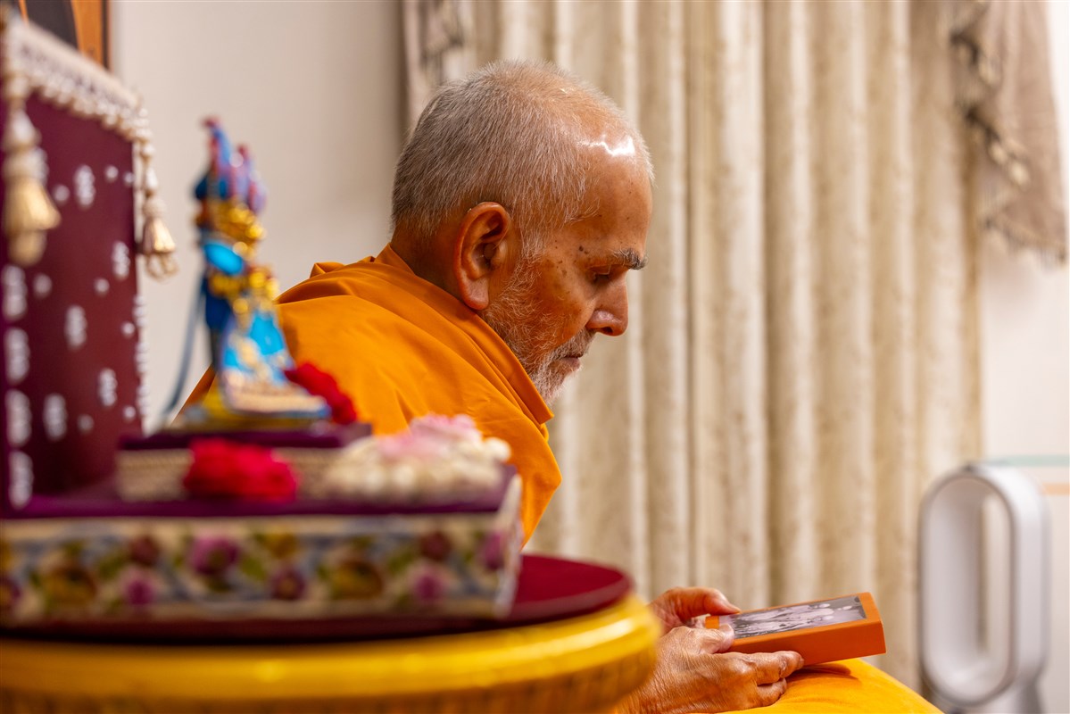 Swamishri engrossed in darshan of Shri Harikrishna Maharaj and Shri Gunatitanand Swami Maharaj