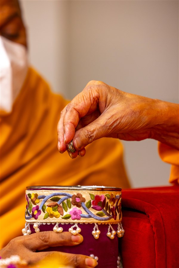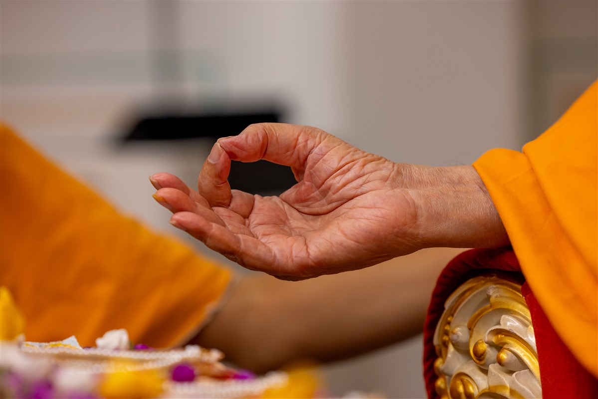 Swamishri sanctifies water with the holy relics of Bhagwan Swaminarayan and the Guru Parampara