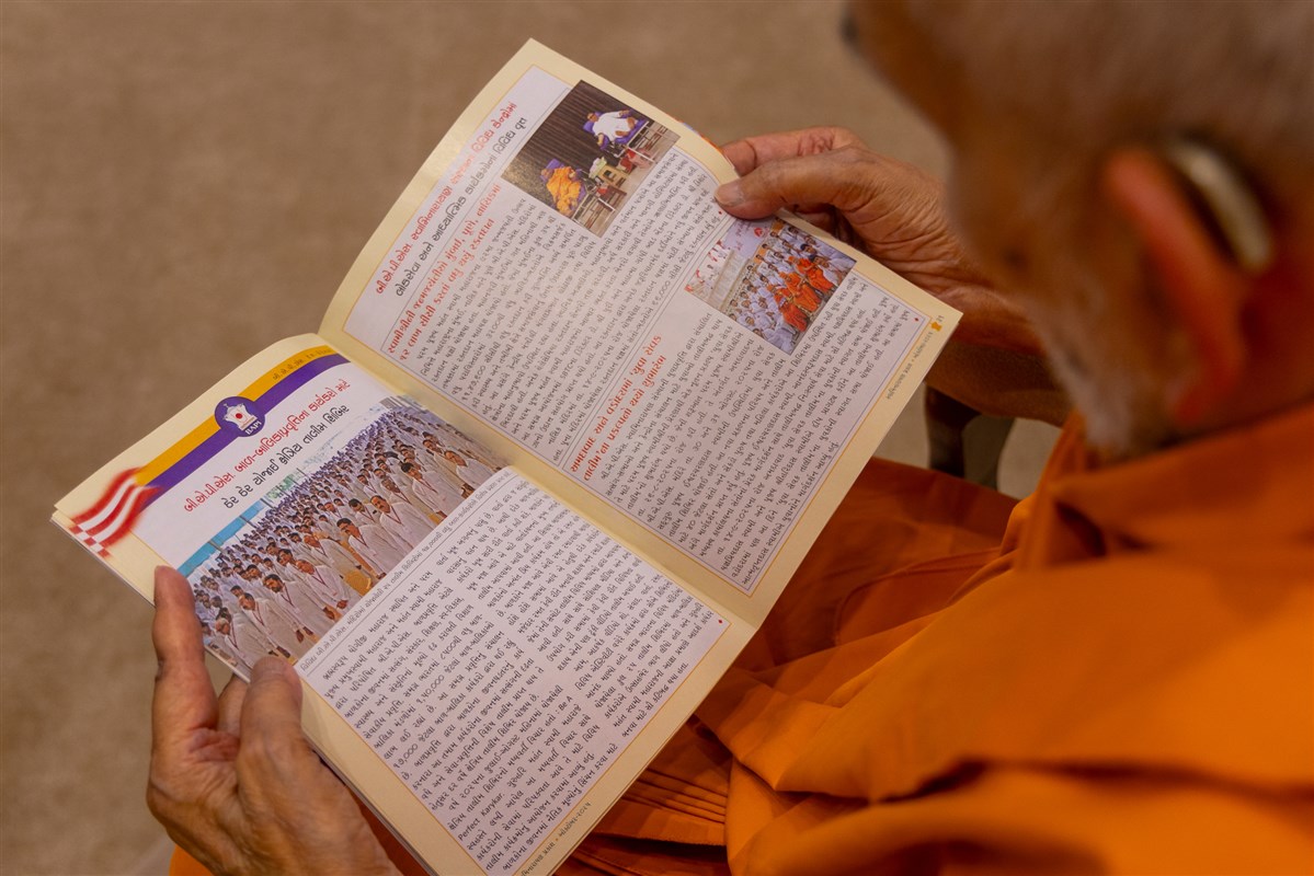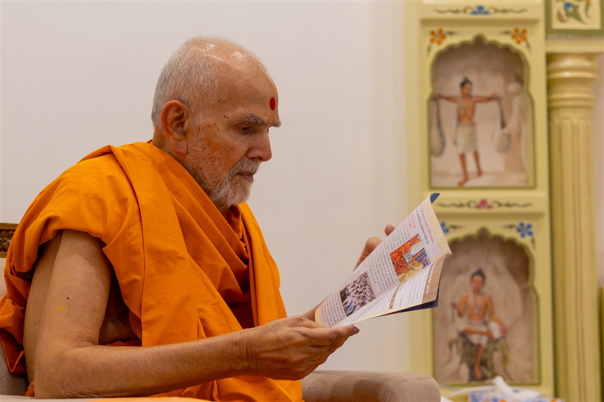 Swamishri reads the latest issue of Gujarati magazine 'Swaminarayan Prakash'