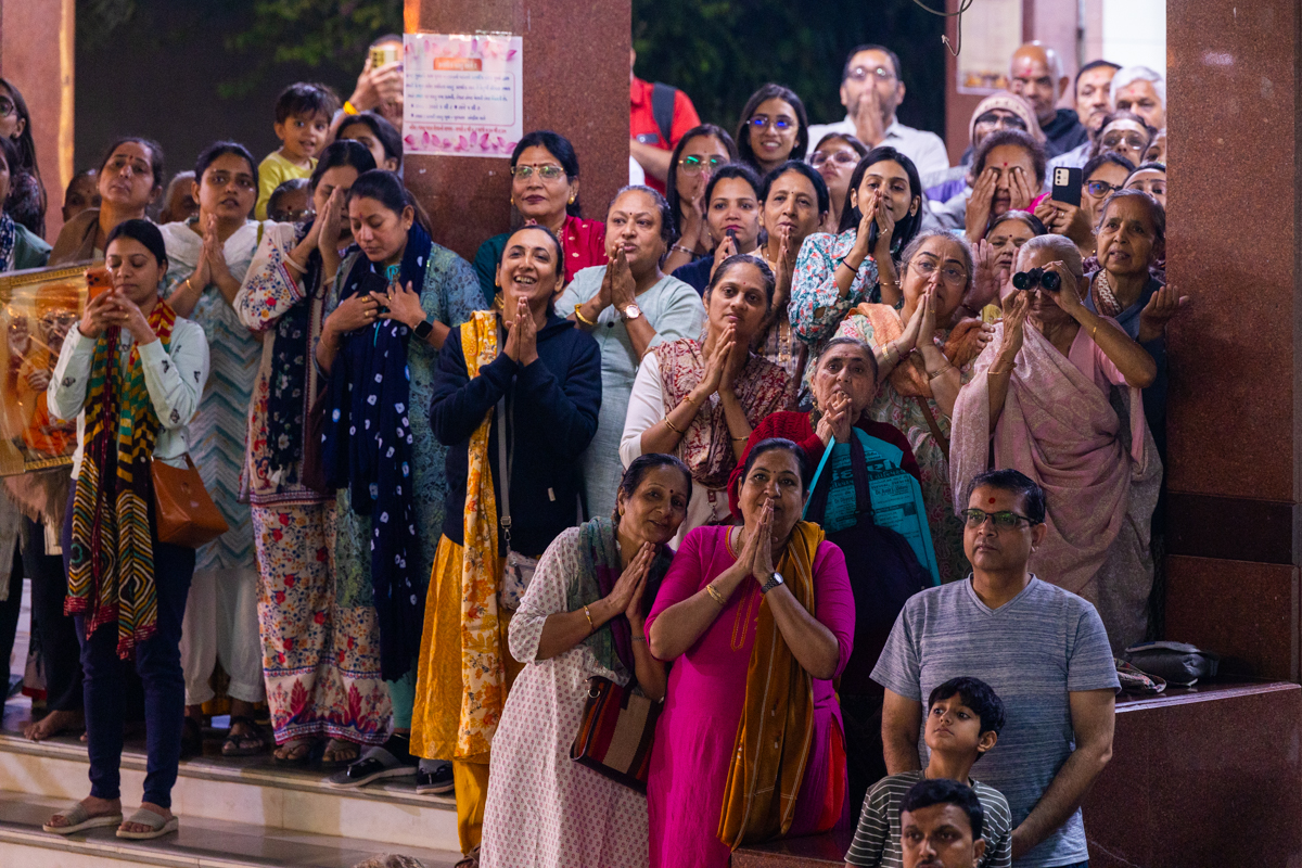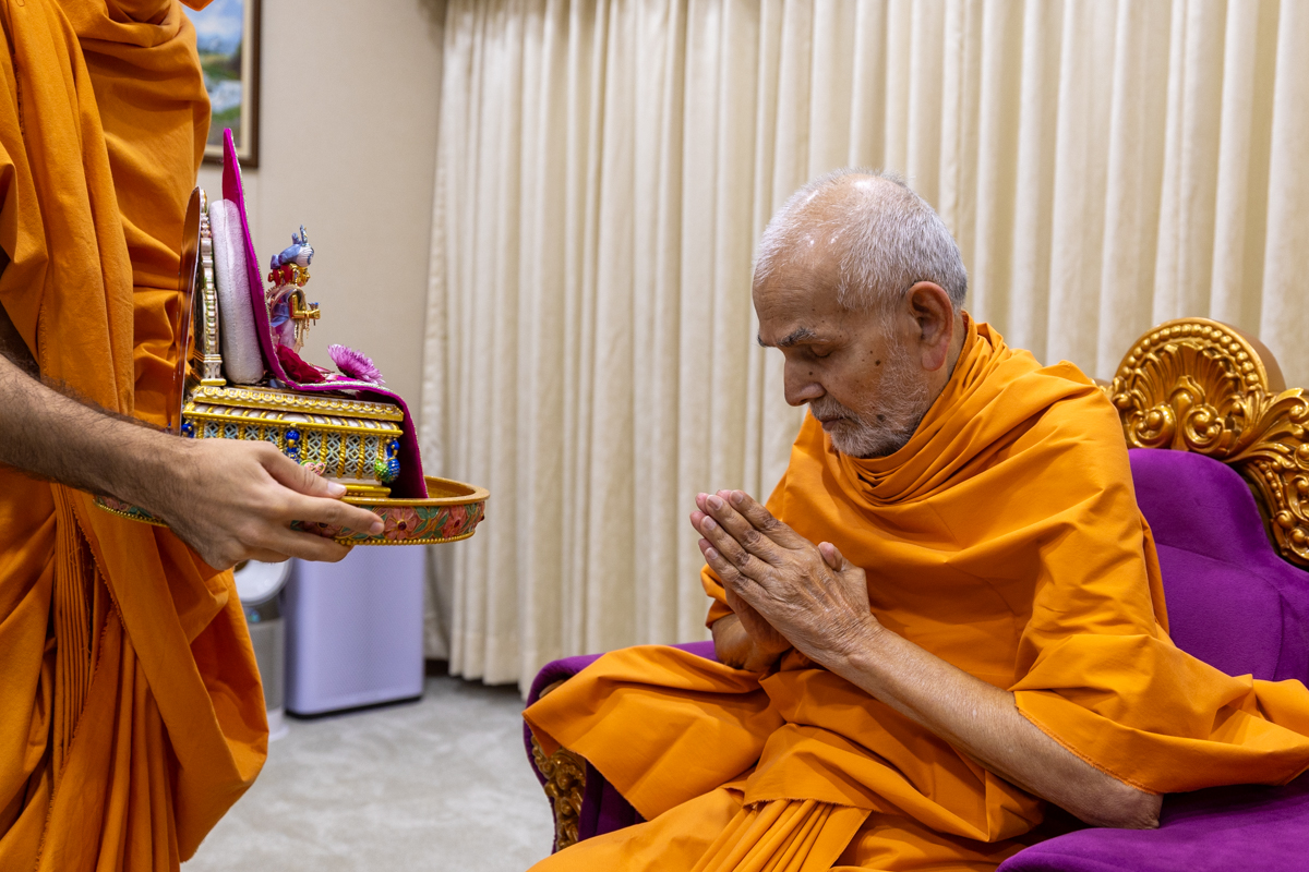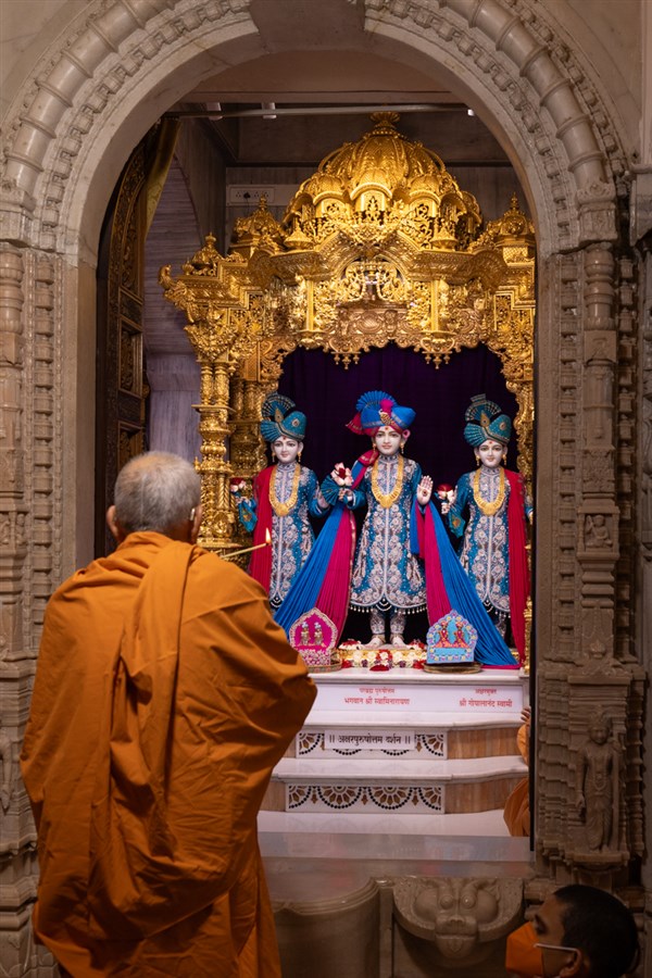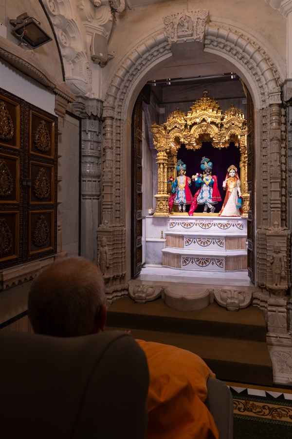 Swamishri engrossed in darshan of Shri Harikrishna Maharaj, Bhagwan Shri Krishna and Shri Radhaji