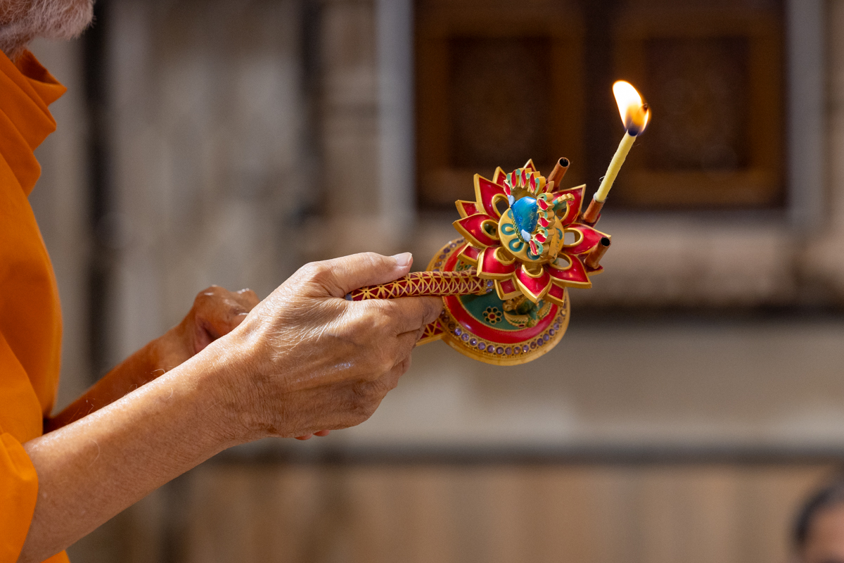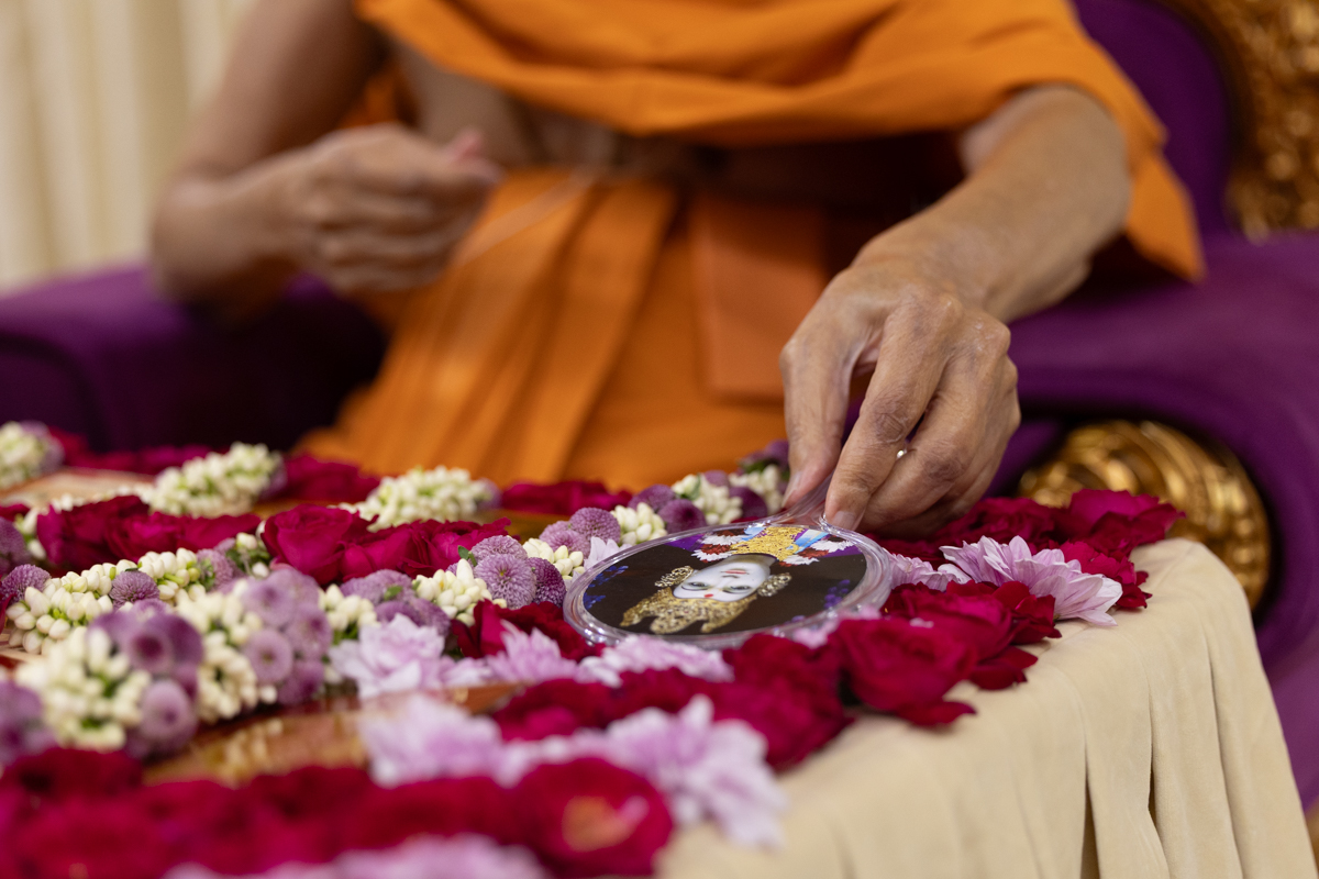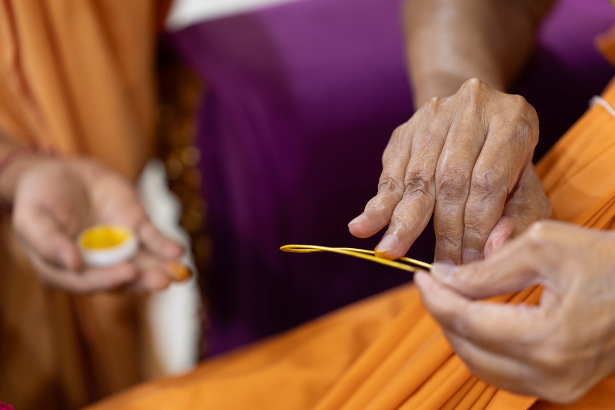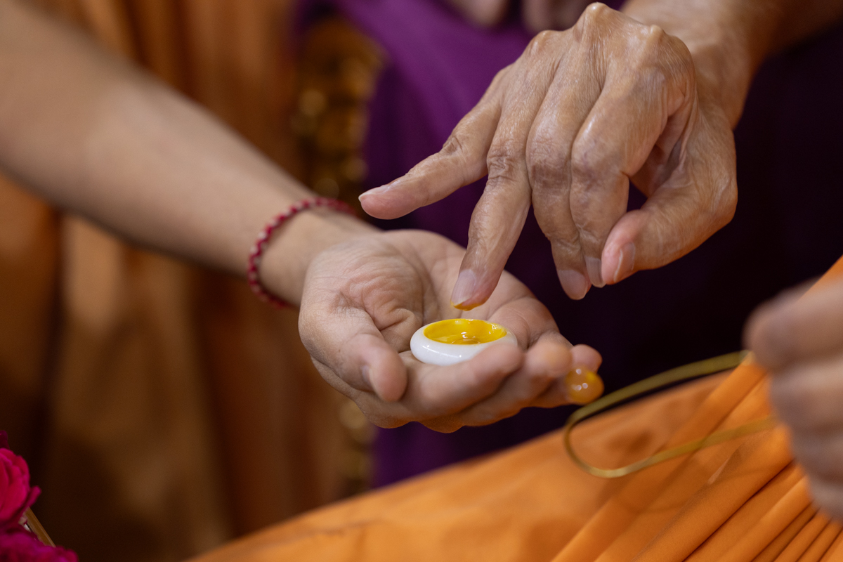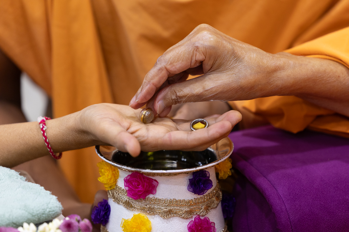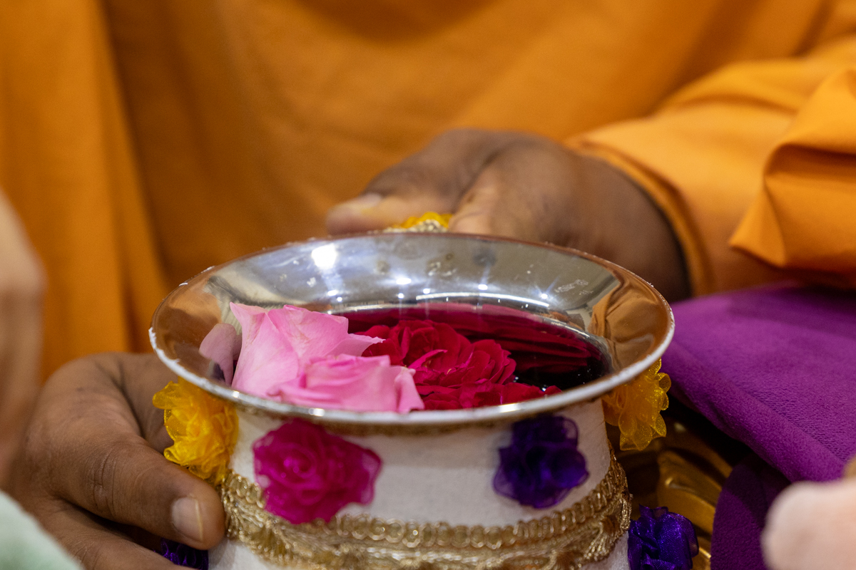 Swamishri sanctifies water with the holy relics of Bhagwan Swaminarayan and the Guru Parampara
