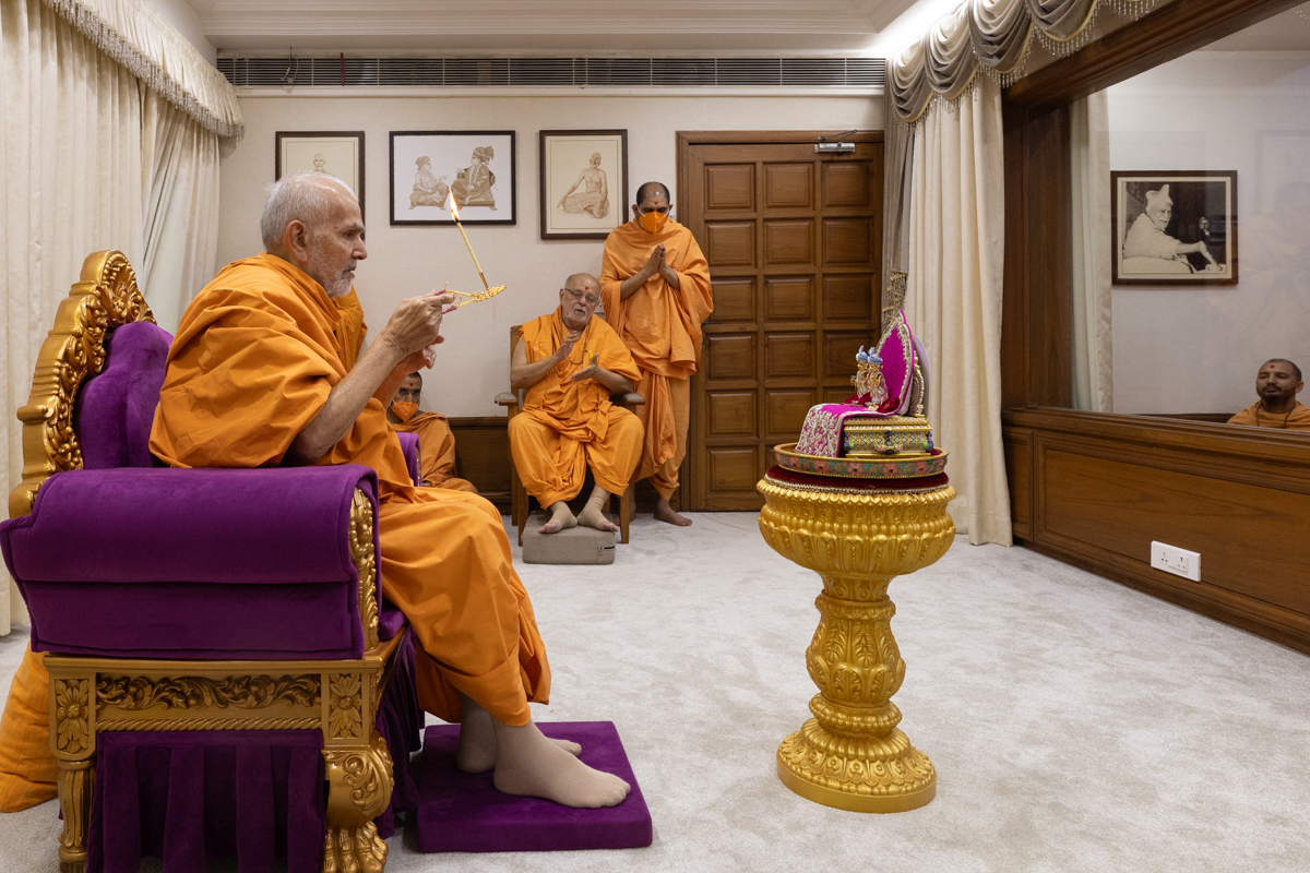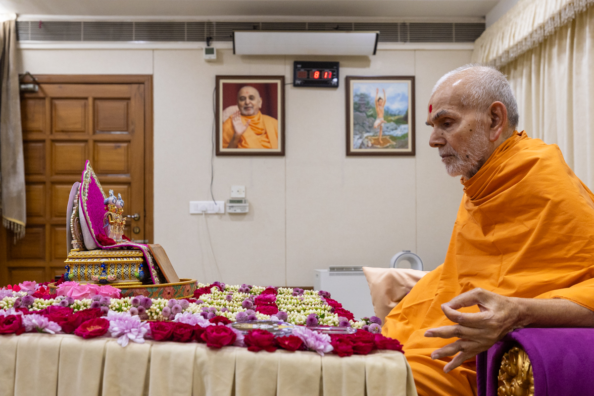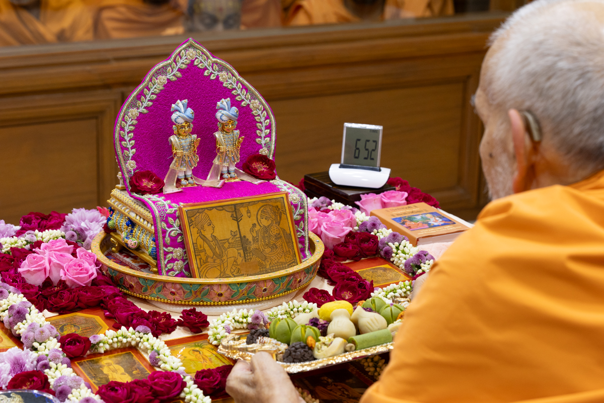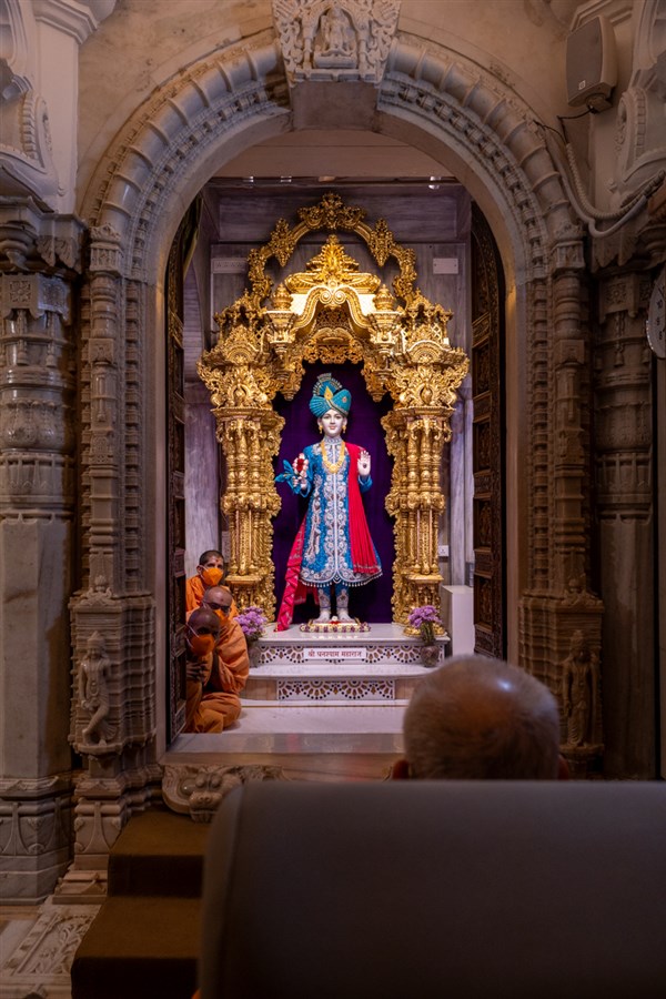 Pujya Ishwarcharan Swami doing Swamishri's puja darshan