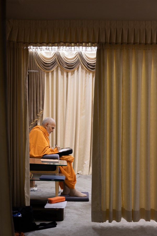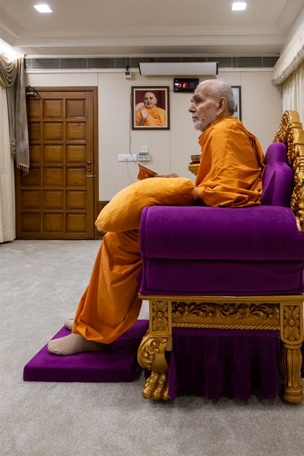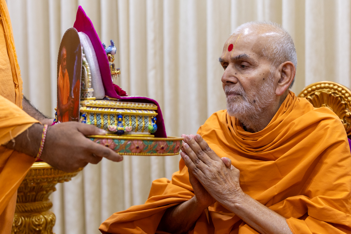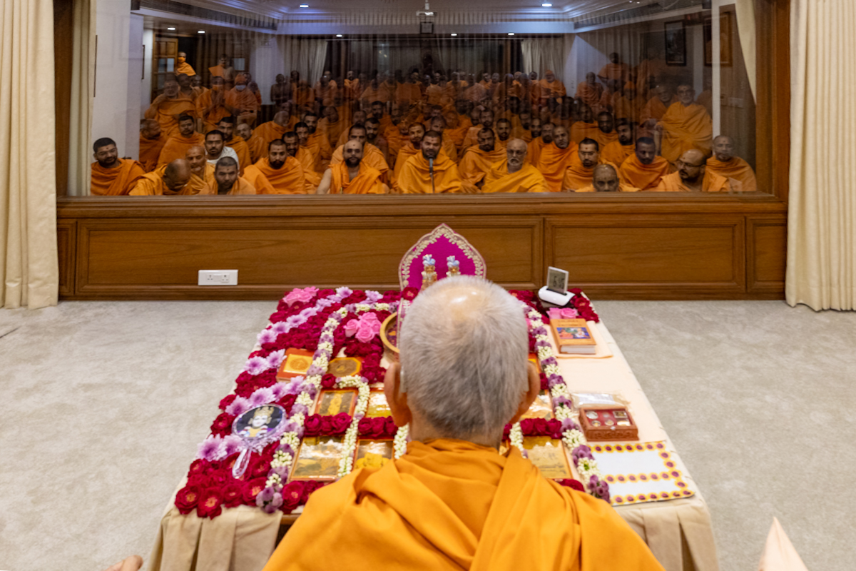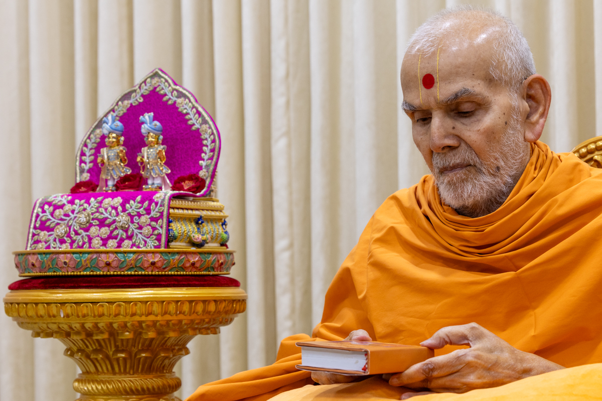 Param Pujya Mahant Swami Maharaj engrossed in darshan of Shri Harikrishna Maharaj and Shri Gunatitanand Swami Maharaj