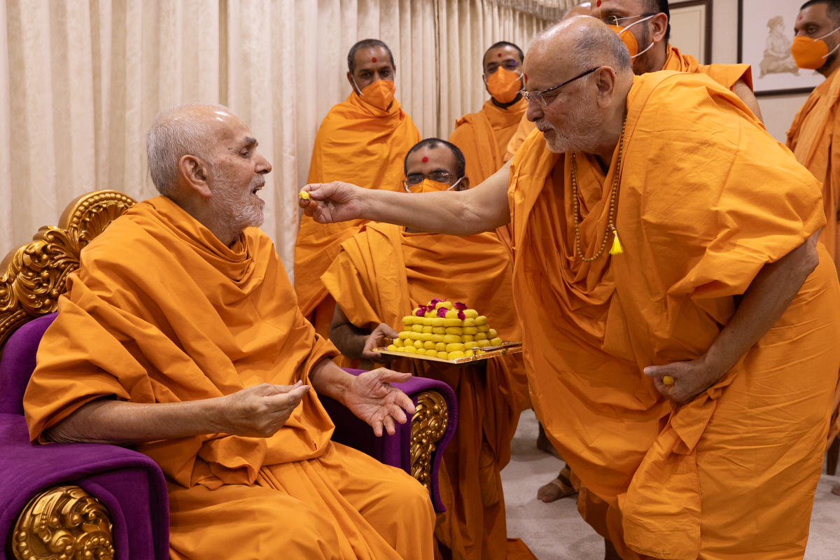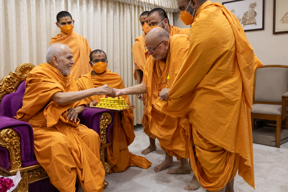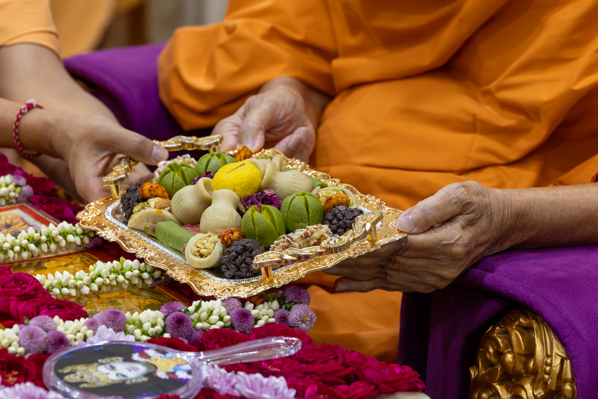 Pujya Ishwarcharan Swami serves a pendo to Swamishri