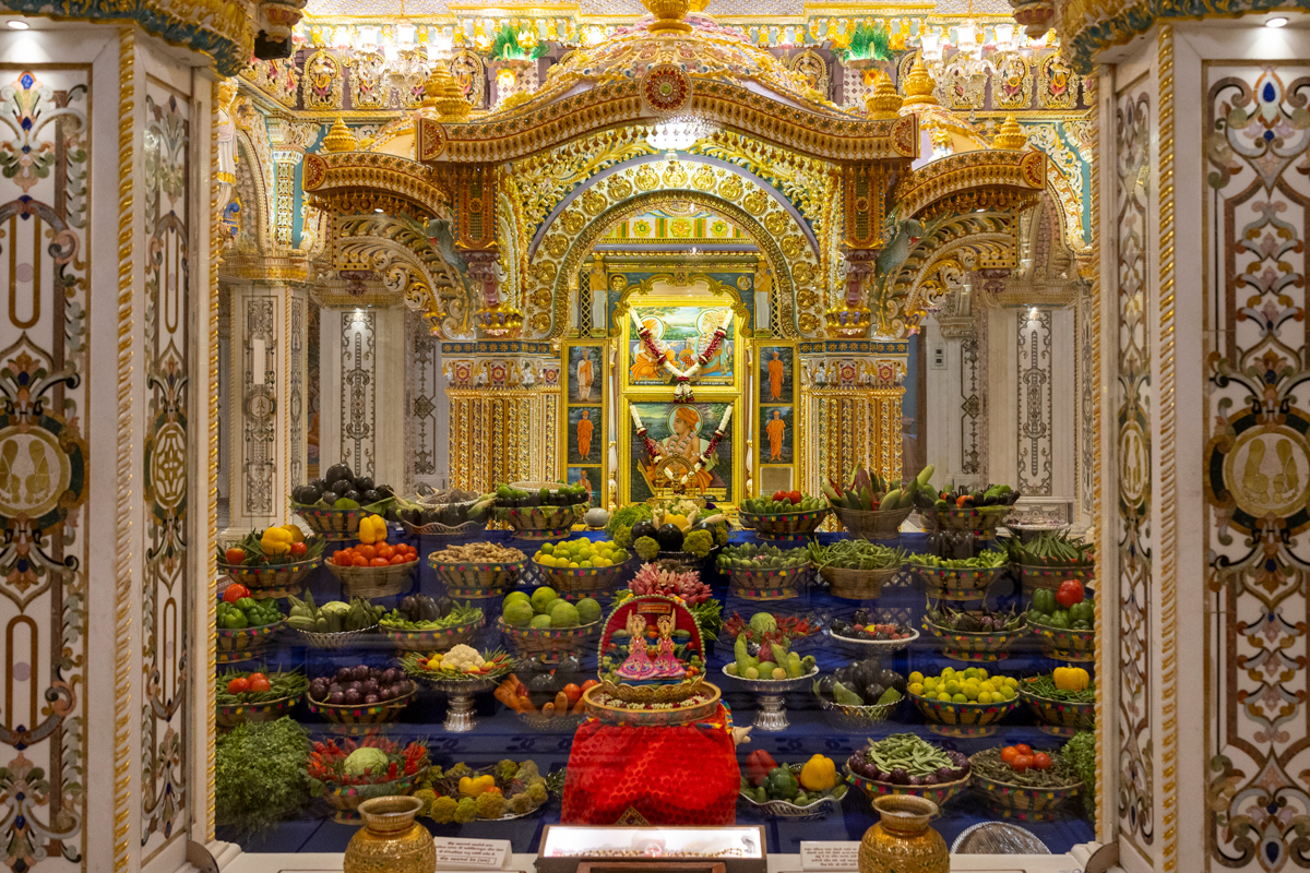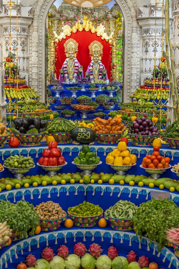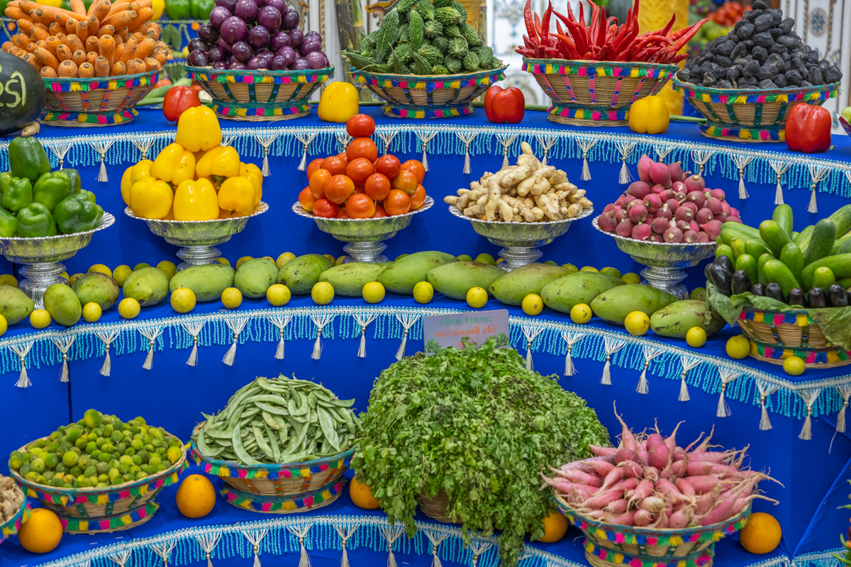Annakut of fruits and vegetables (Haatadi) offered to Bhagwan Swaminarayan and Aksharbrahma Gunatitanand Swami