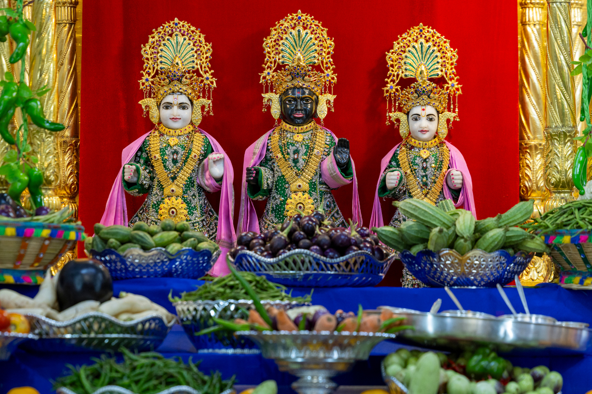 Annakut of fruits and vegetables (Haatadi) offered to Bhagwan Swaminarayan, Aksharbrahma Gunatitanand Swami and Shri Gopalanand Swami