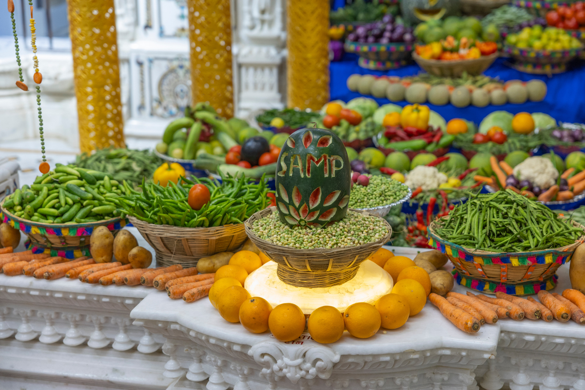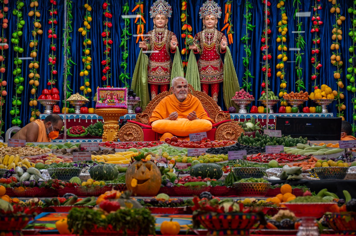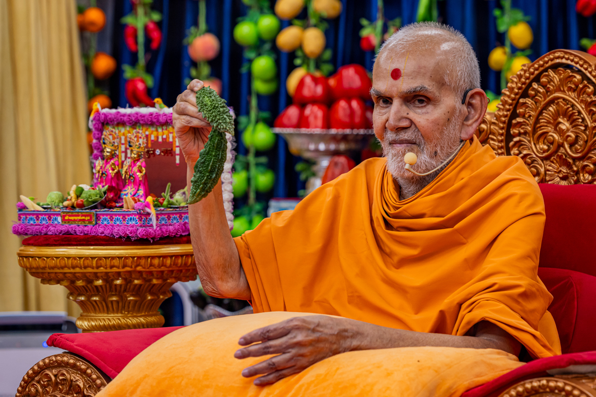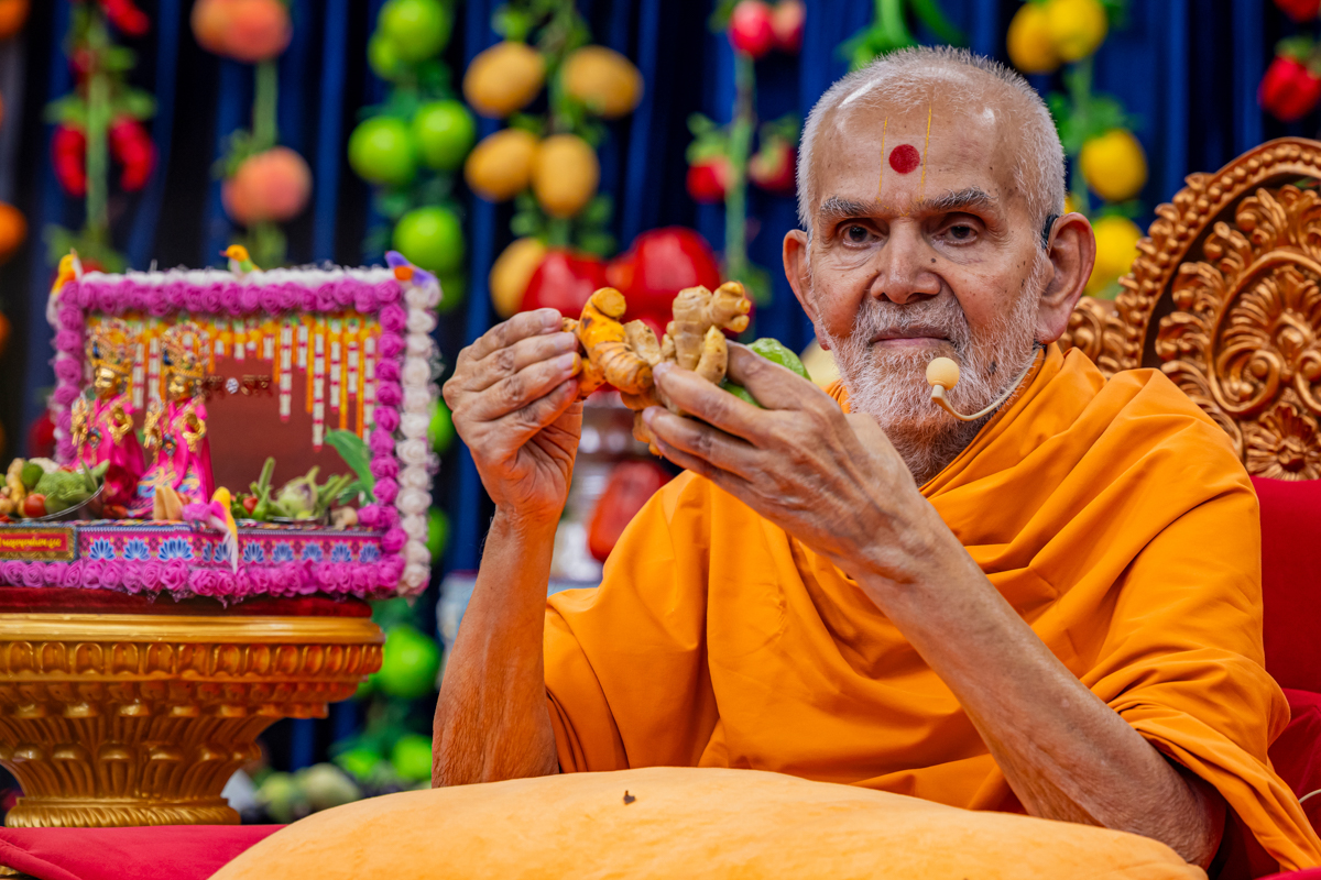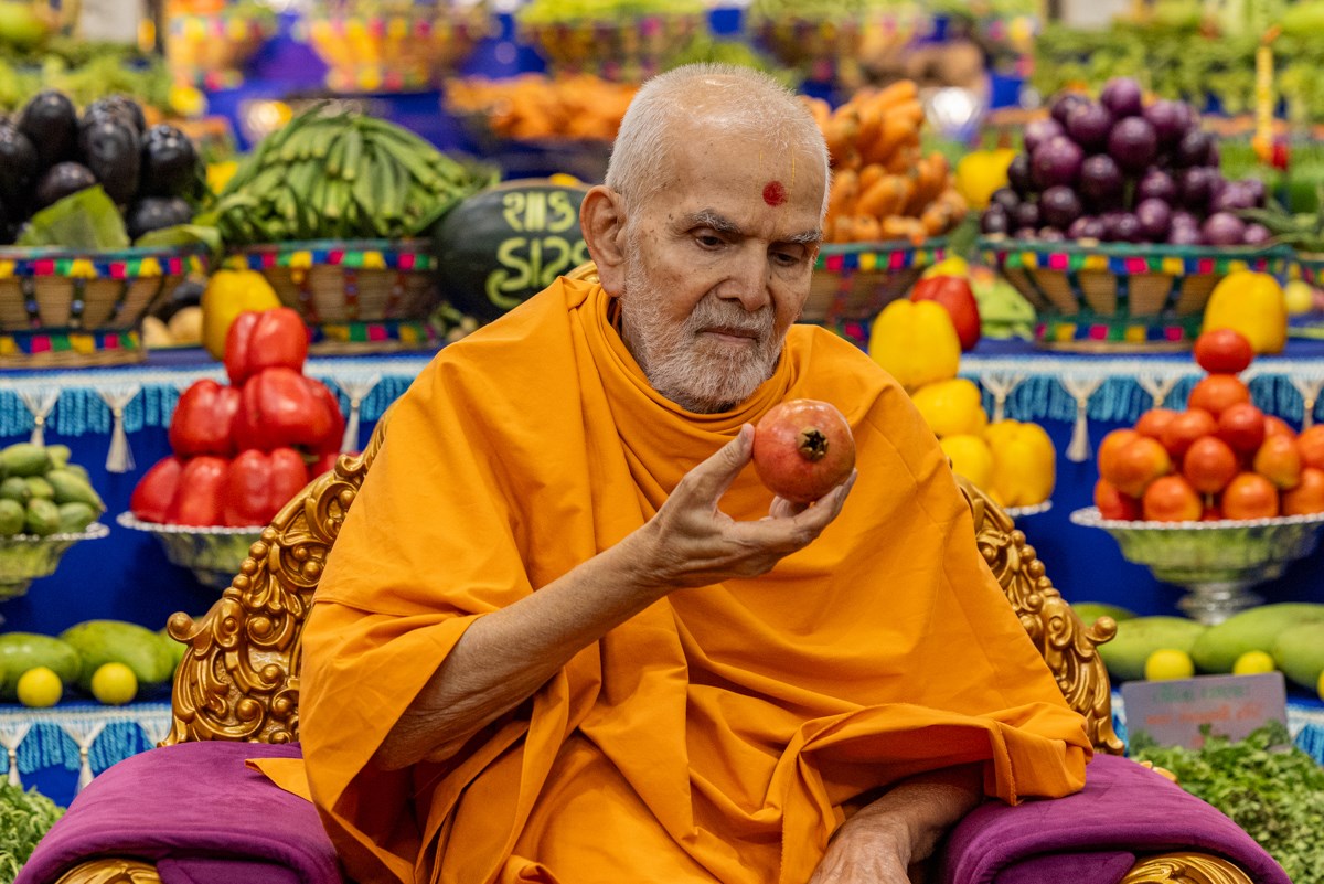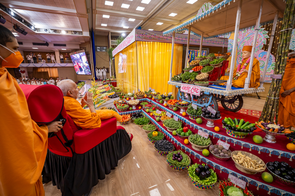 Swamishri observes the annakut of fruits and vegetables