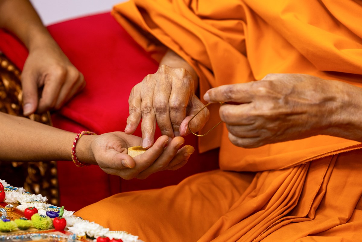 Param Pujya Mahant Swami Maharaj applies a tilak on his forehead