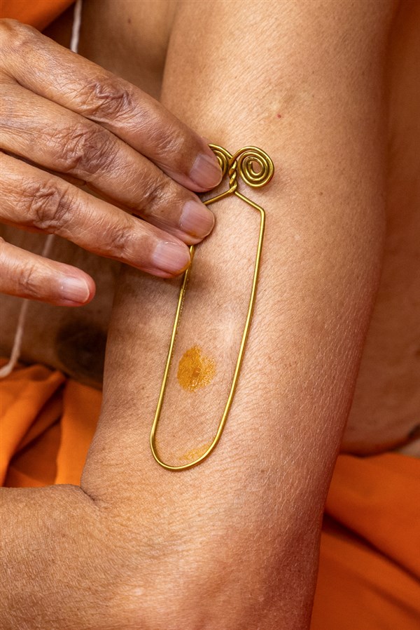 Swamishri applies a tilak on his upper arm