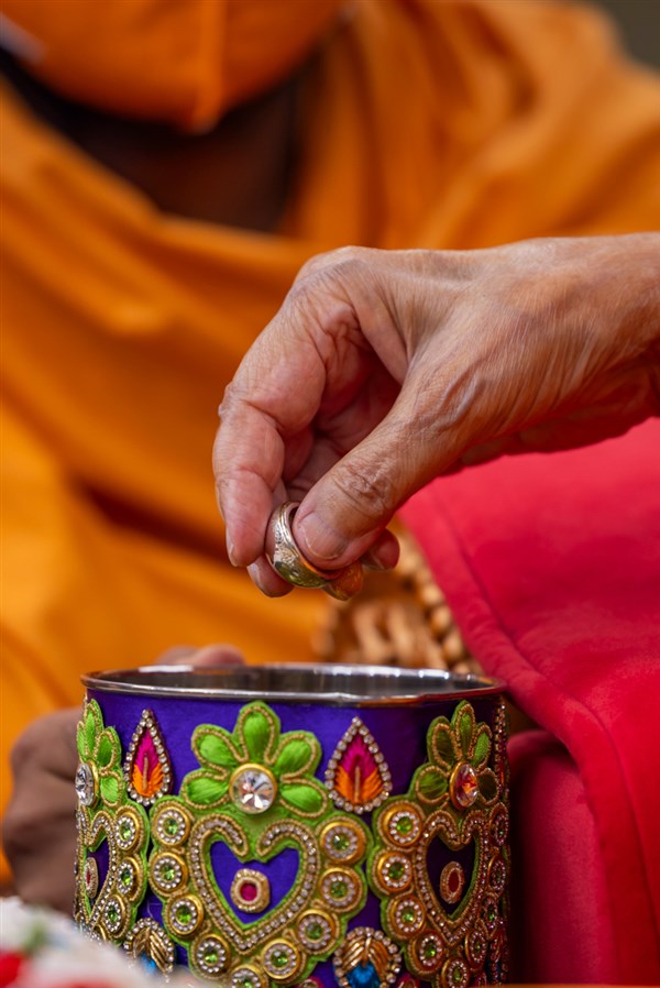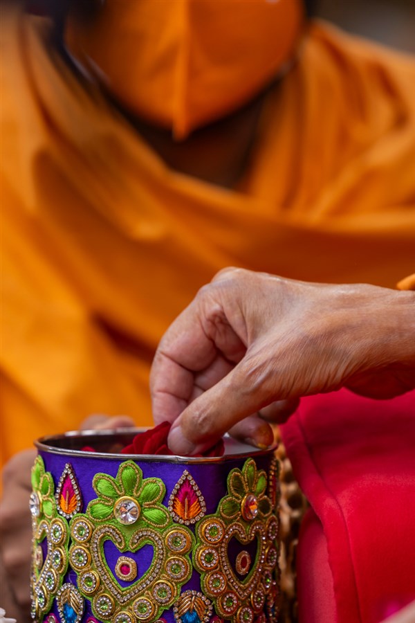 Swamishri adds flowers to the sanctified water
