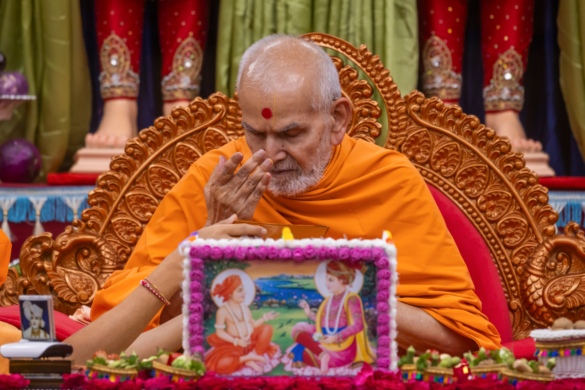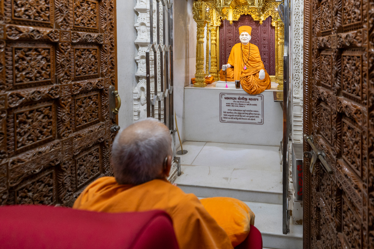 Swamishri engrossed in darshan of Shri Harikrishna Maharaj and Shri Gunatitanand Swami Maharaj