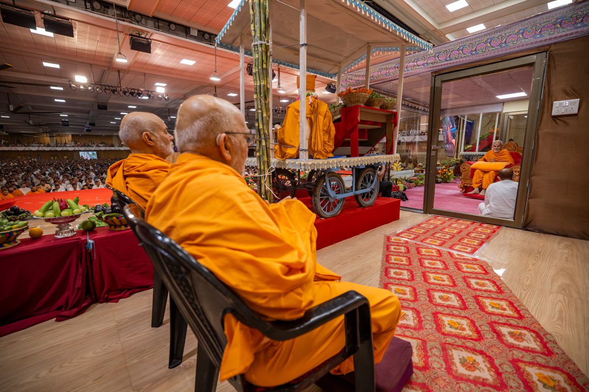 Pujya Ghanshyamcharan Swami and Pujya Viveksagar Swami doing darshan of Swamishri