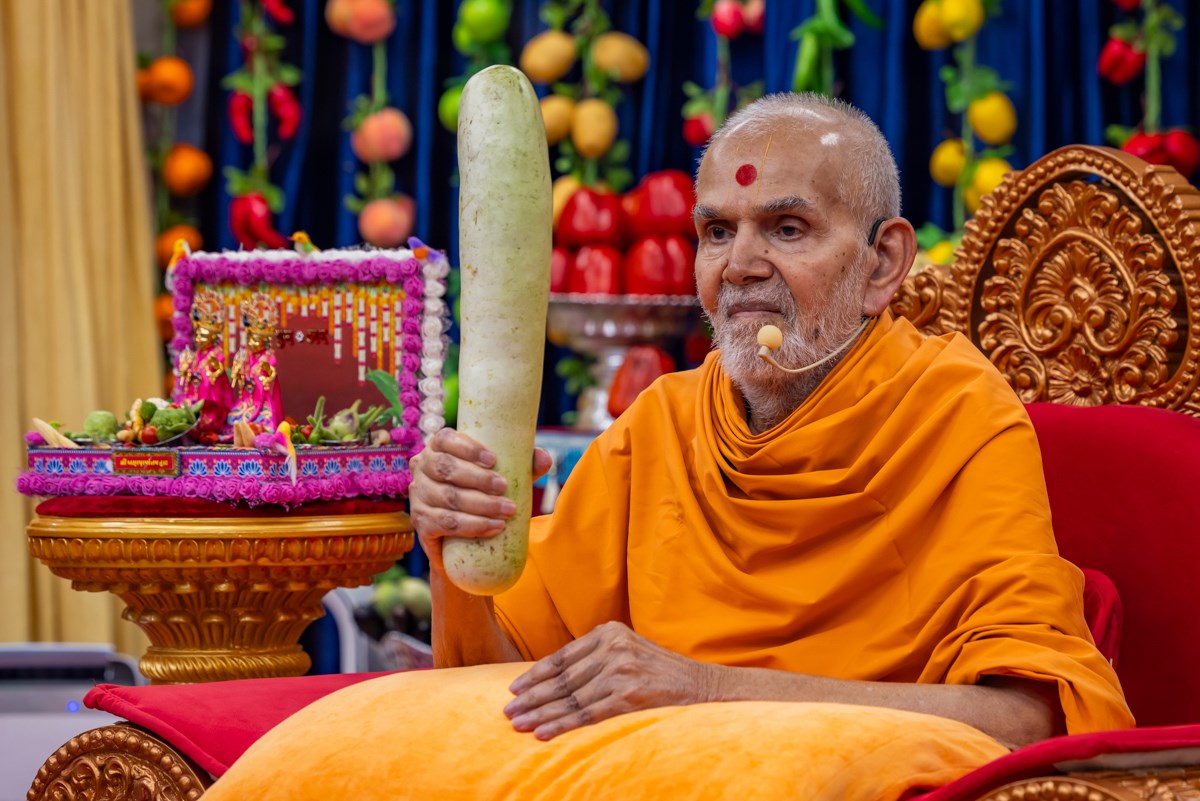 Swamishri sanctifies a bottle gourd (dudhi)