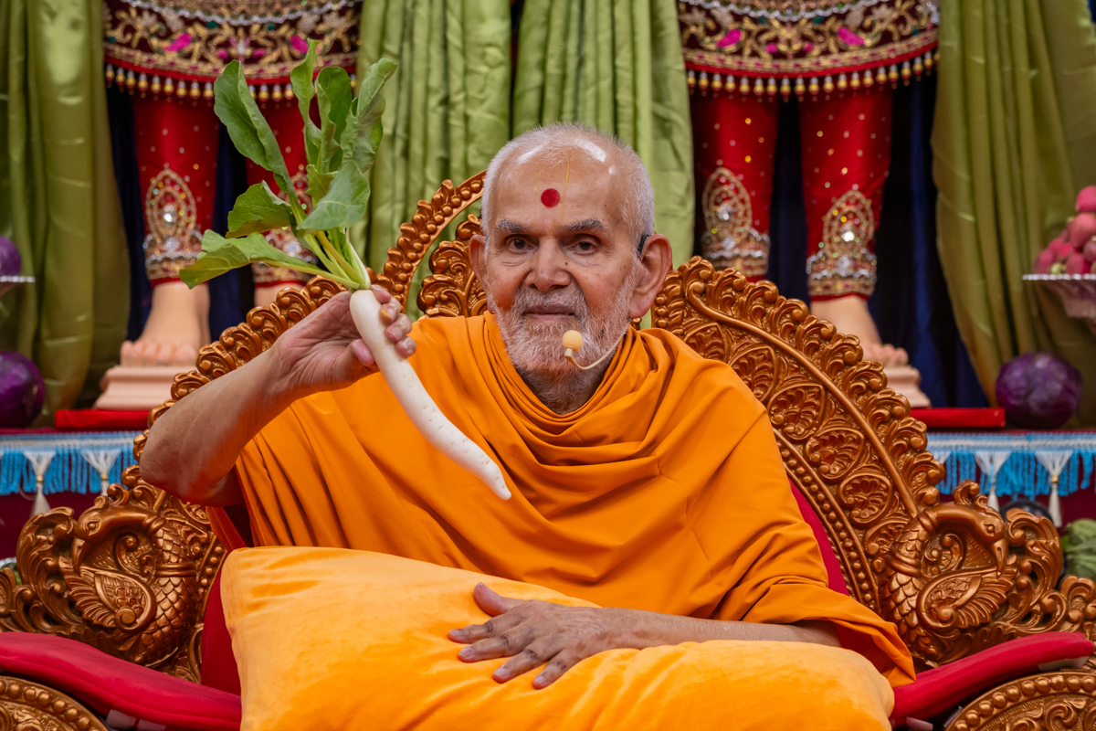 Swamishri sanctifies a radish (mulo)