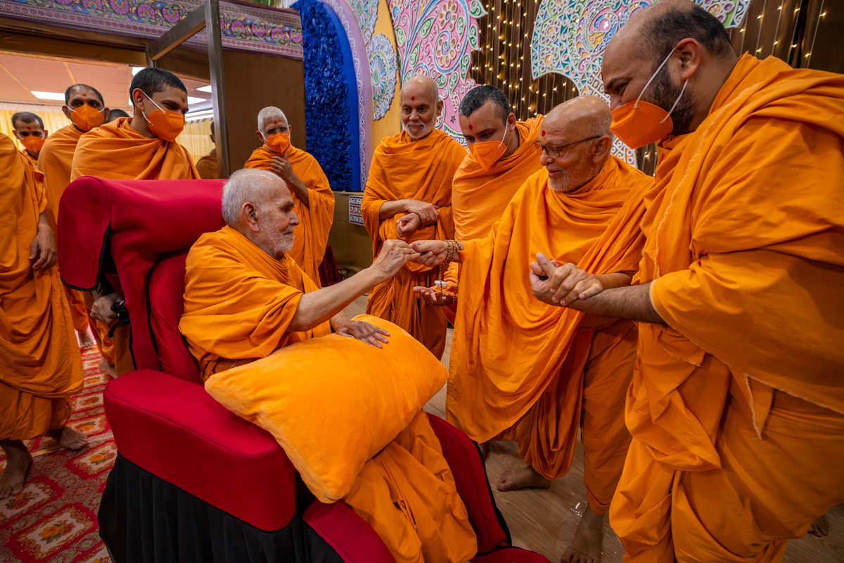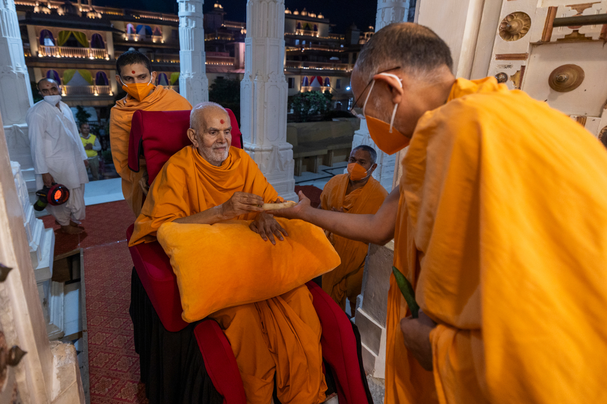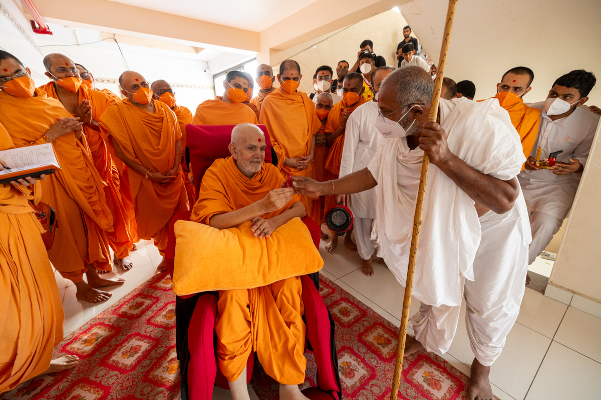 Swamishri gives prasad to Pujya Ghanshyamcharan Swami