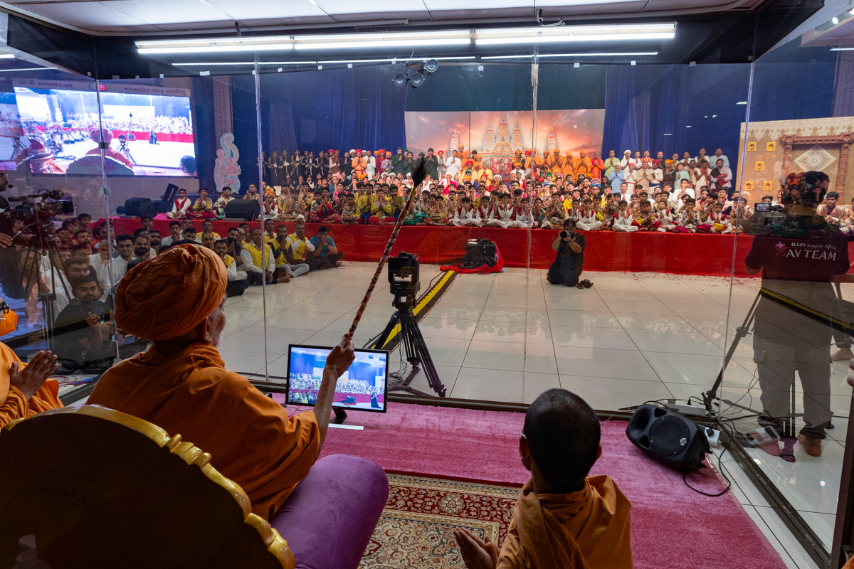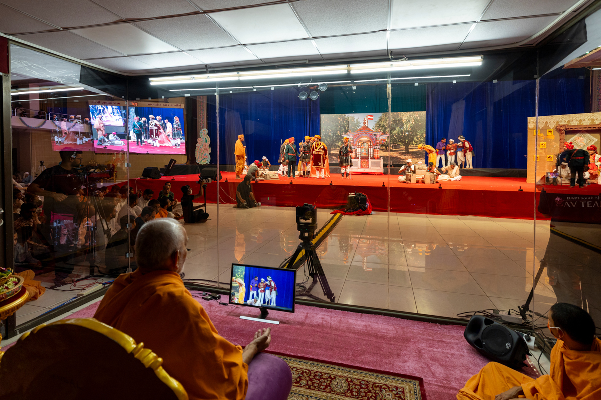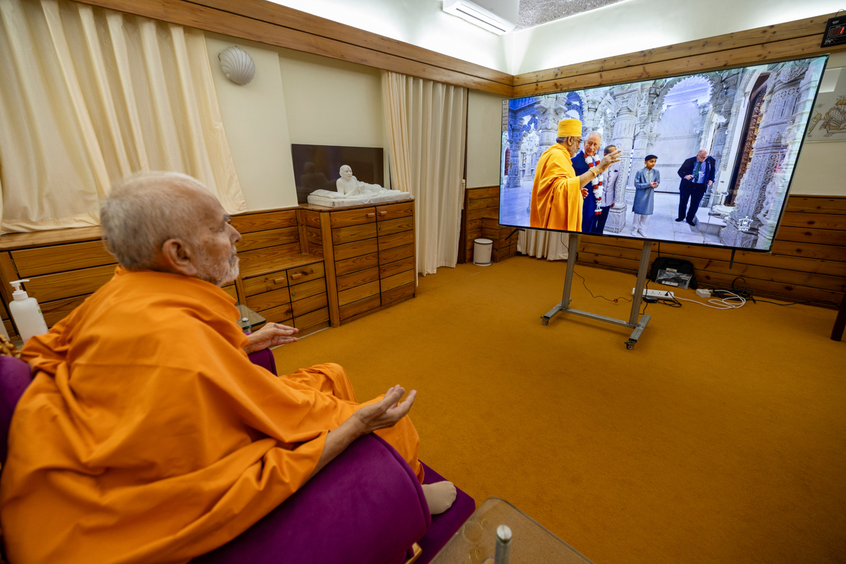 Swamishri watches a video of King Charles's visit to the London Mandir