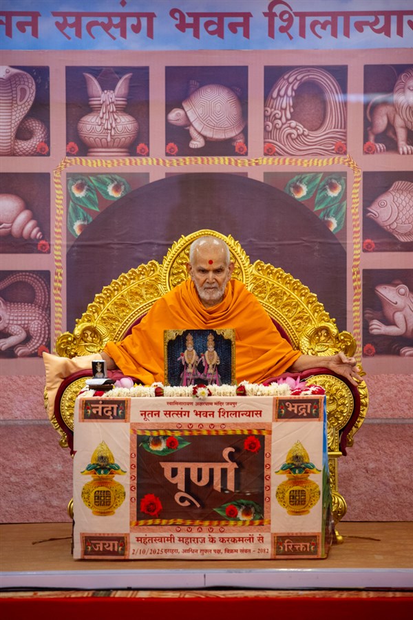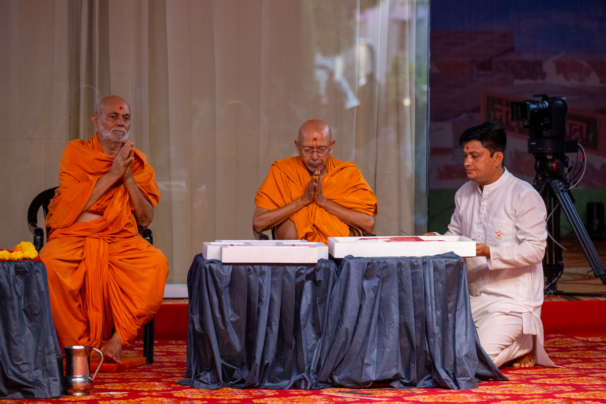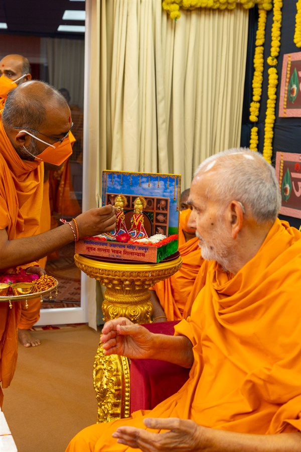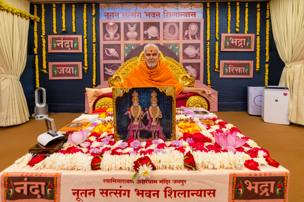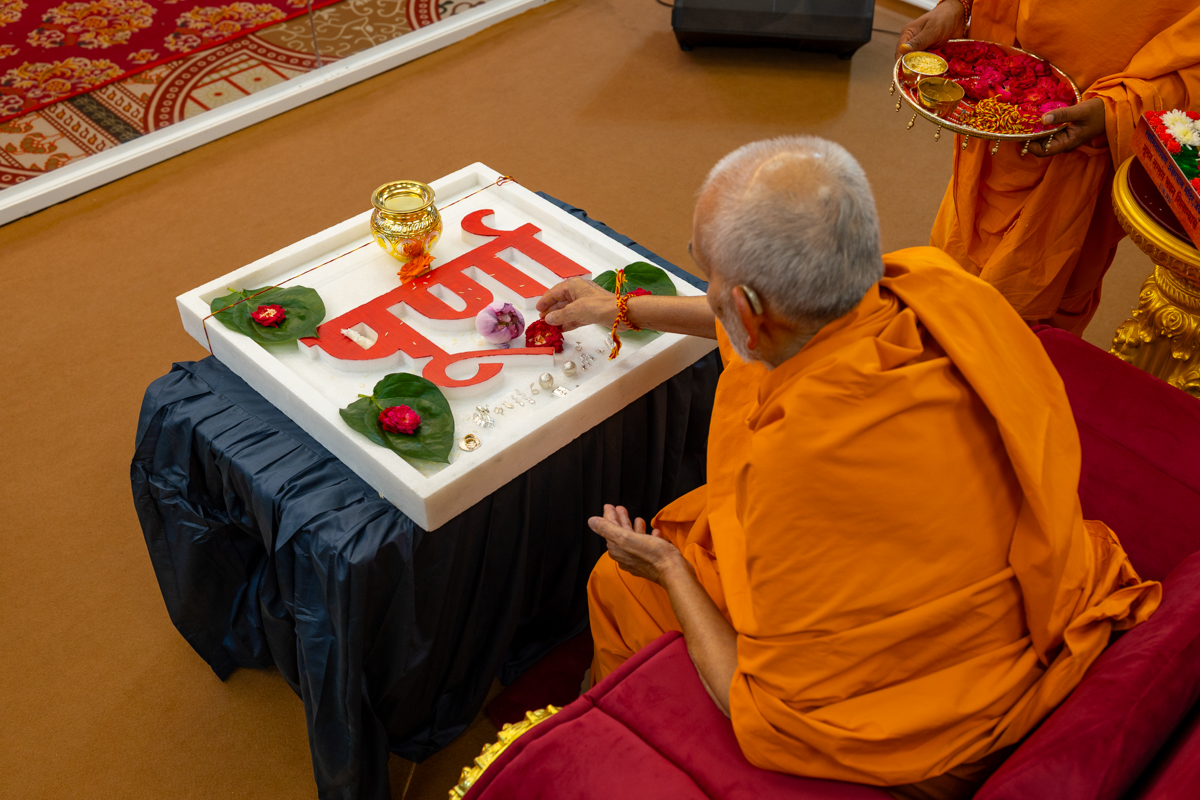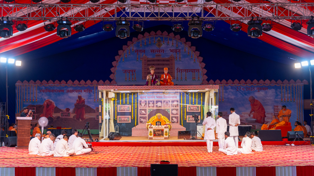 Pujya Tyagvallabh Swami and Pujya Viveksagar Swami perform the shilanyas mahapuja rituals for the new Satsang Bhavan at BAPS Shri Swaminarayan Mandir, Jaipur