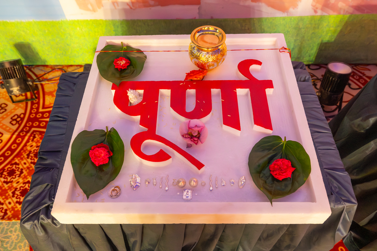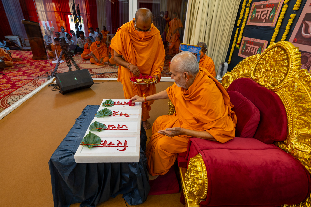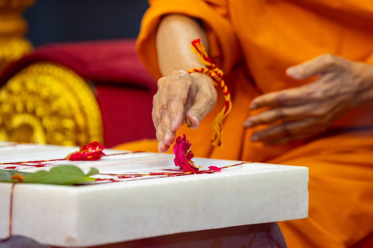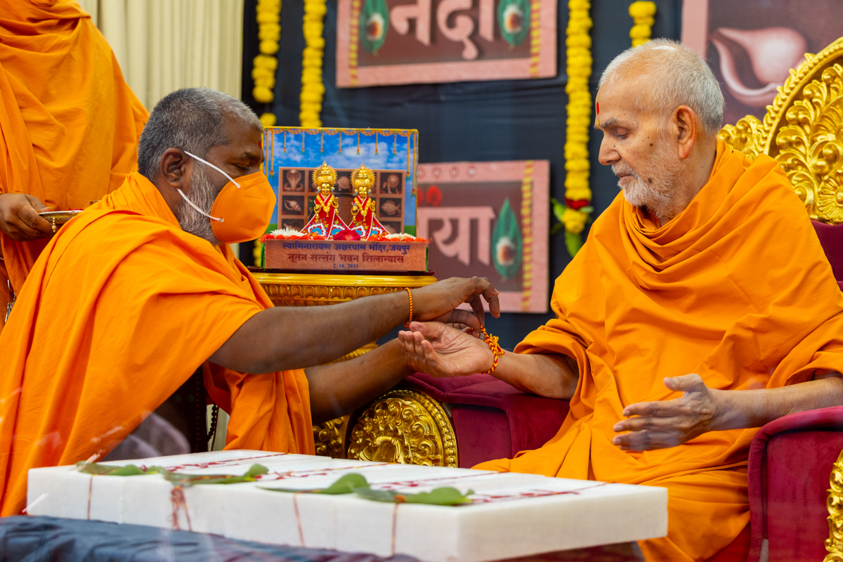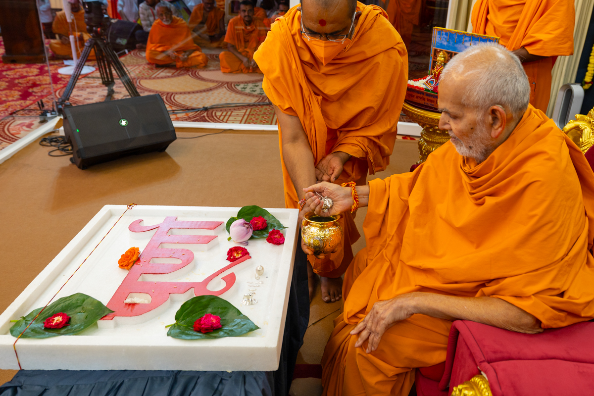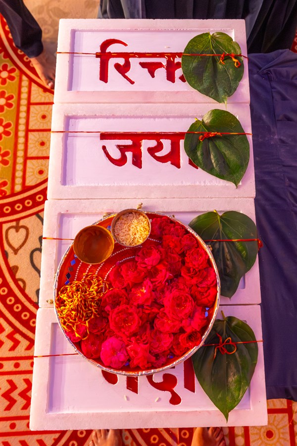 Pujya Tyagvallabh Swami and Pujya Viveksagar Swami perform the shilanyas mahapuja rituals for the new Satsang Bhavan at BAPS Shri Swaminarayan Mandir, Jaipur