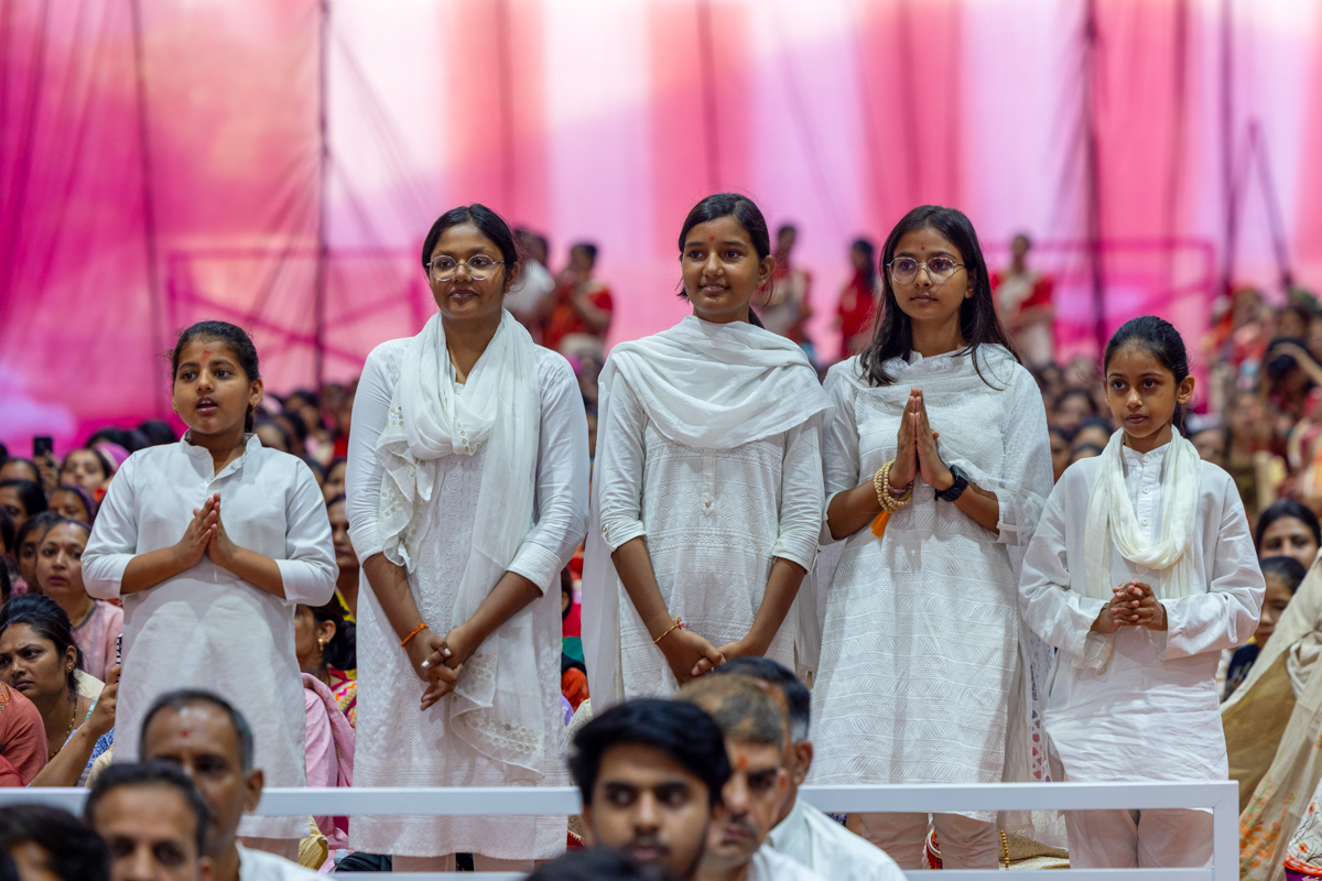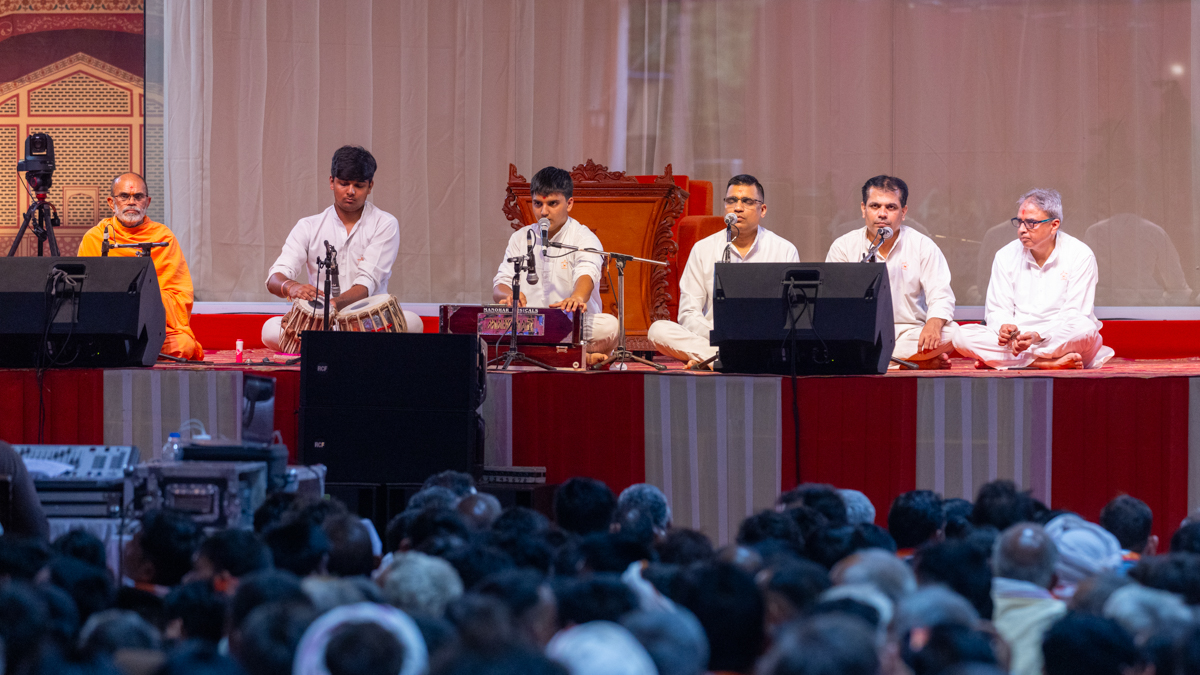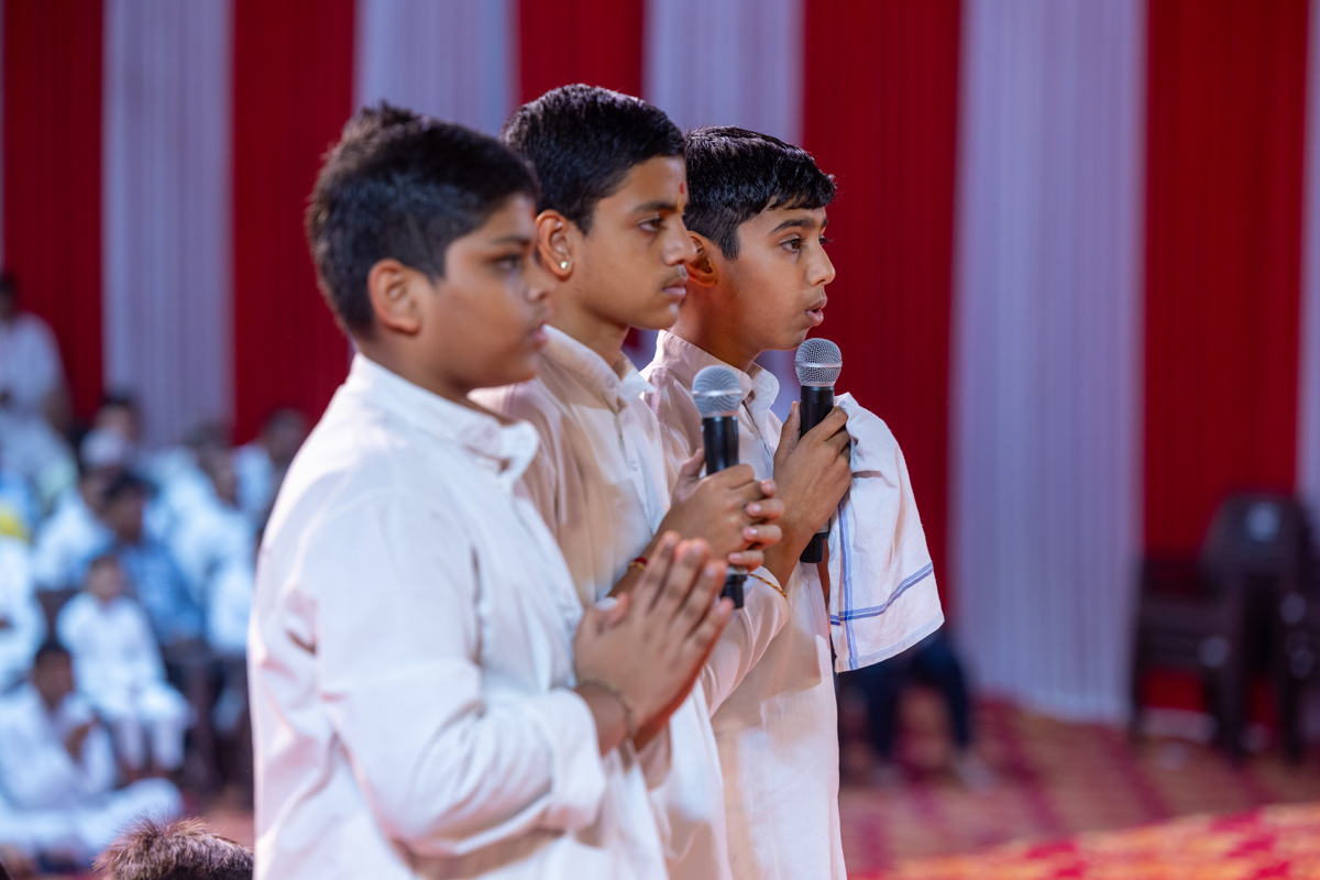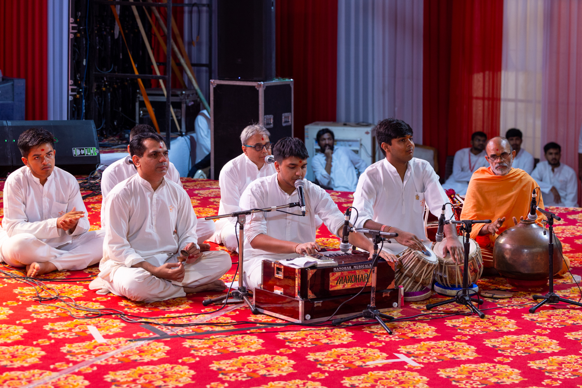 Youths sing kirtans at the beginning of the evening satsang assembly