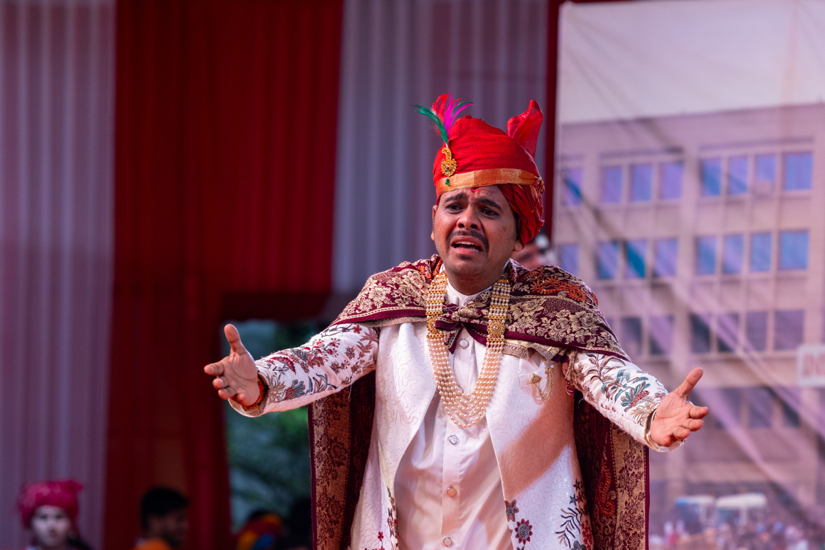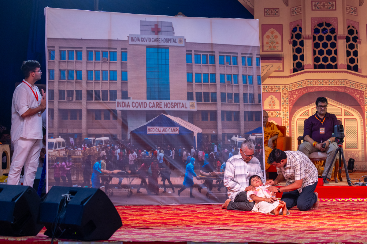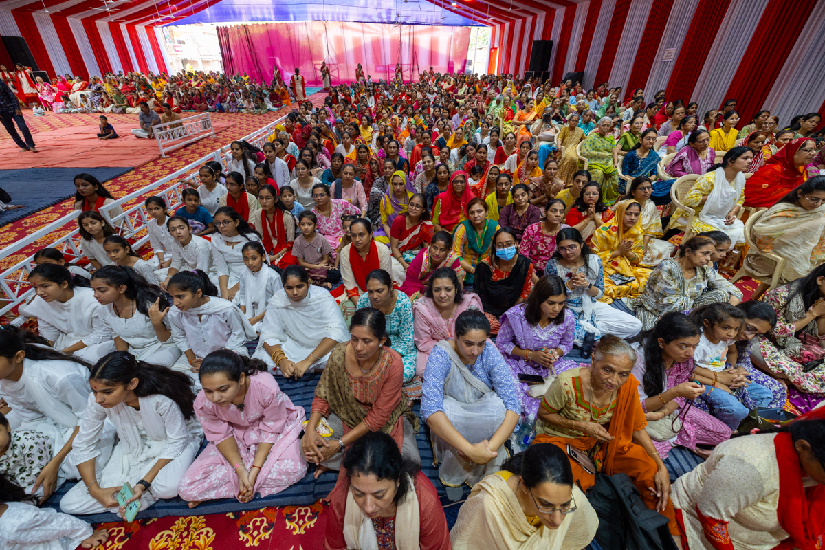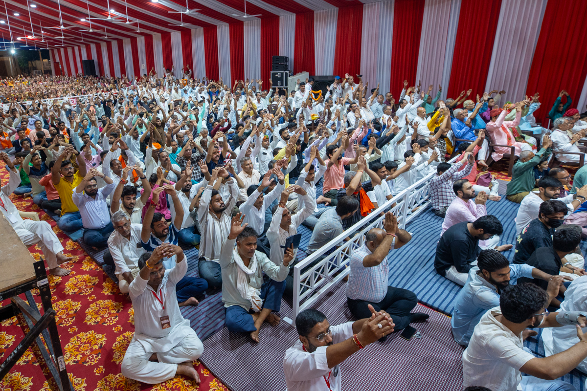 Youths sing kirtans at the beginning of the evening satsang assembly