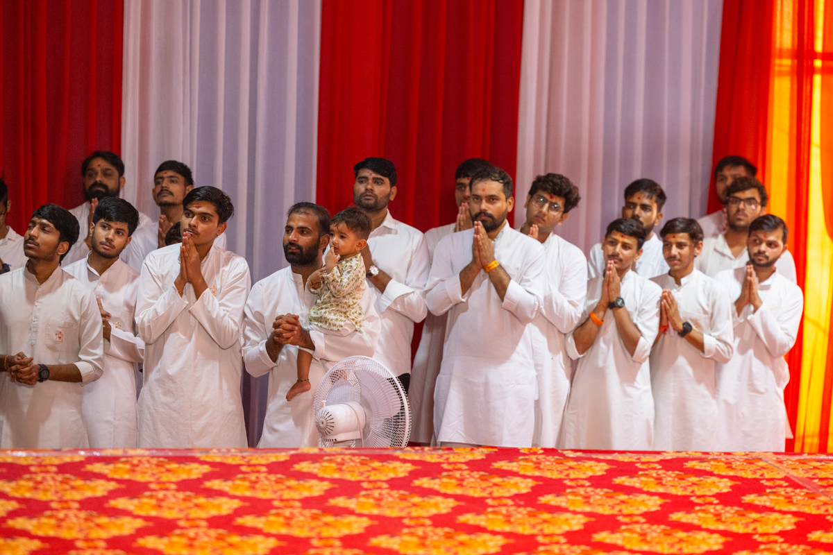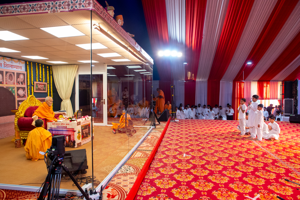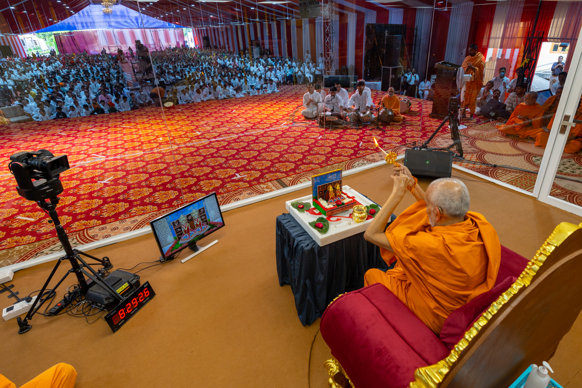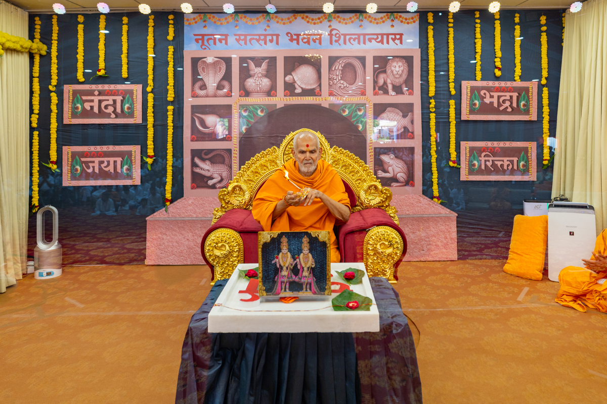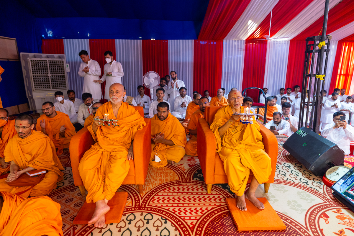 Pujya Tyagvallabh Swami and Pujya Viveksagar Swami perform the shilanyas arti