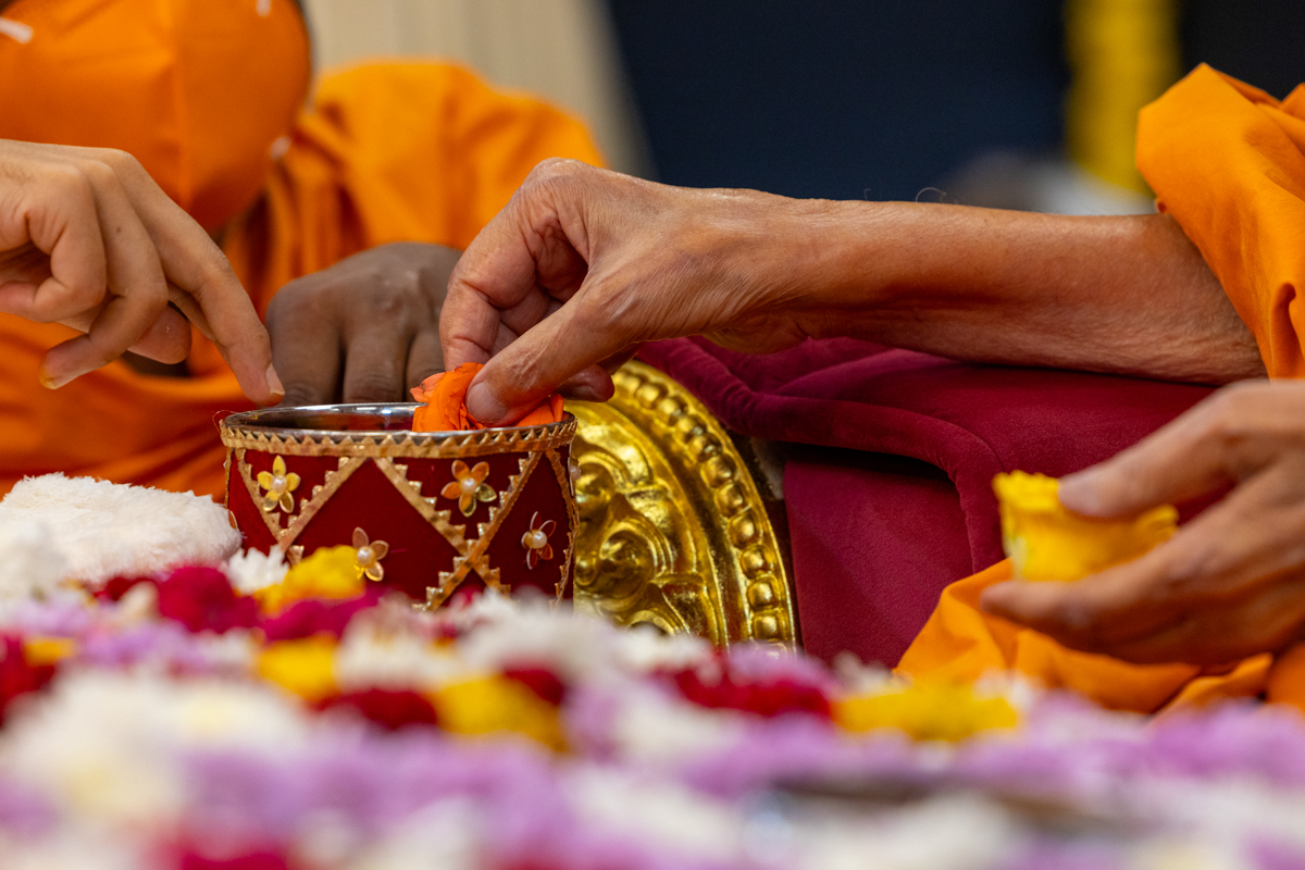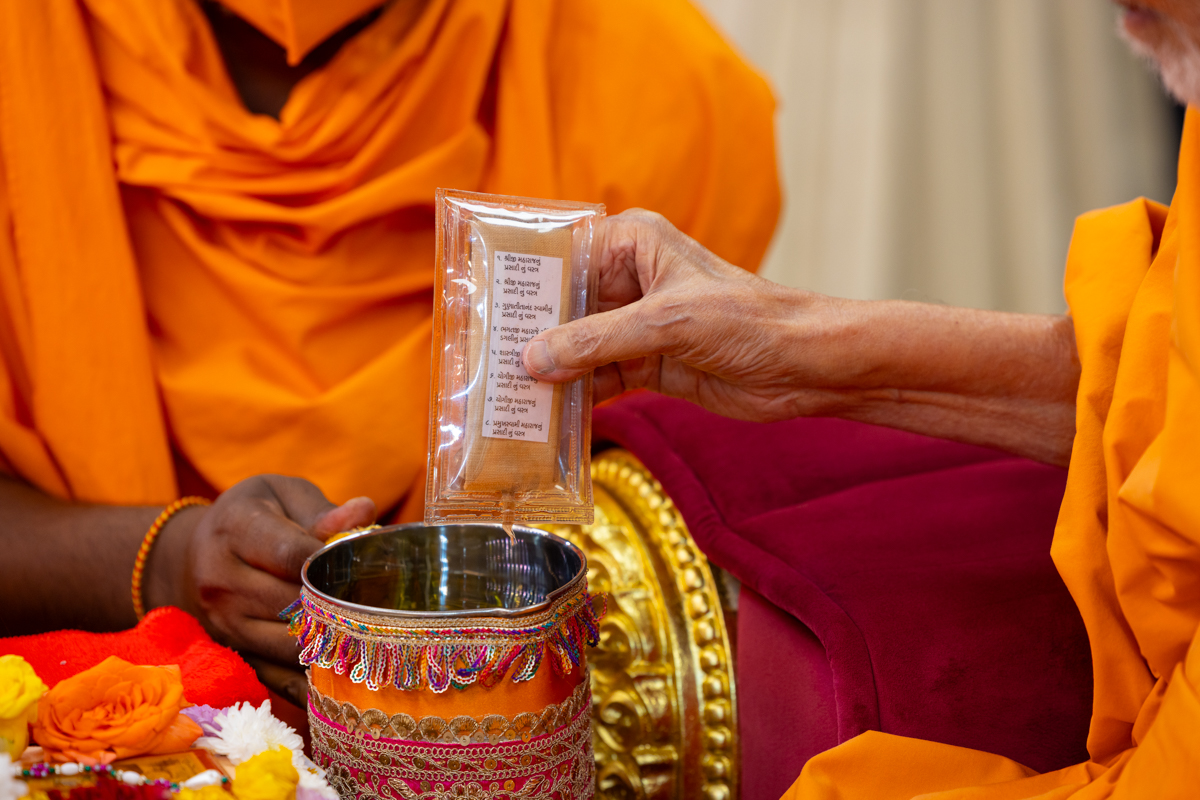 Swamishri sanctifies water with the holy relics of Bhagwan Swaminarayan and the Guru Parampara