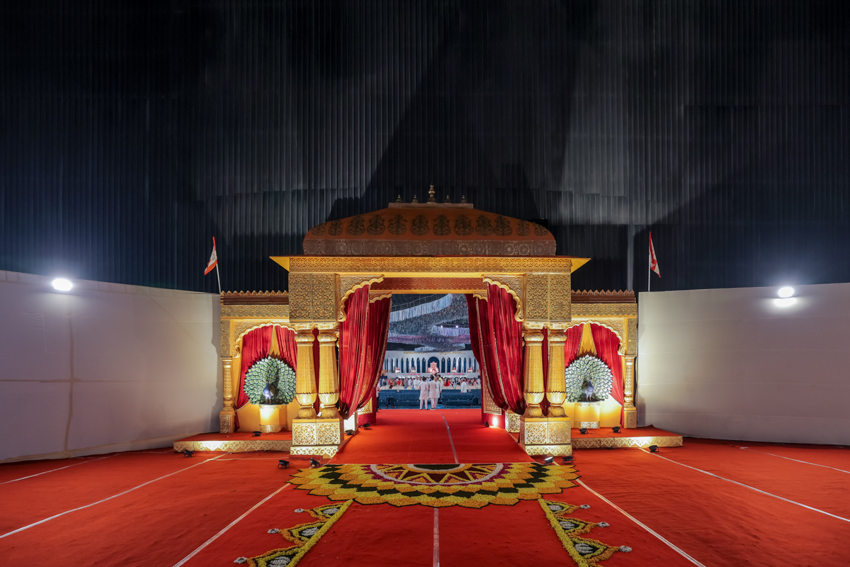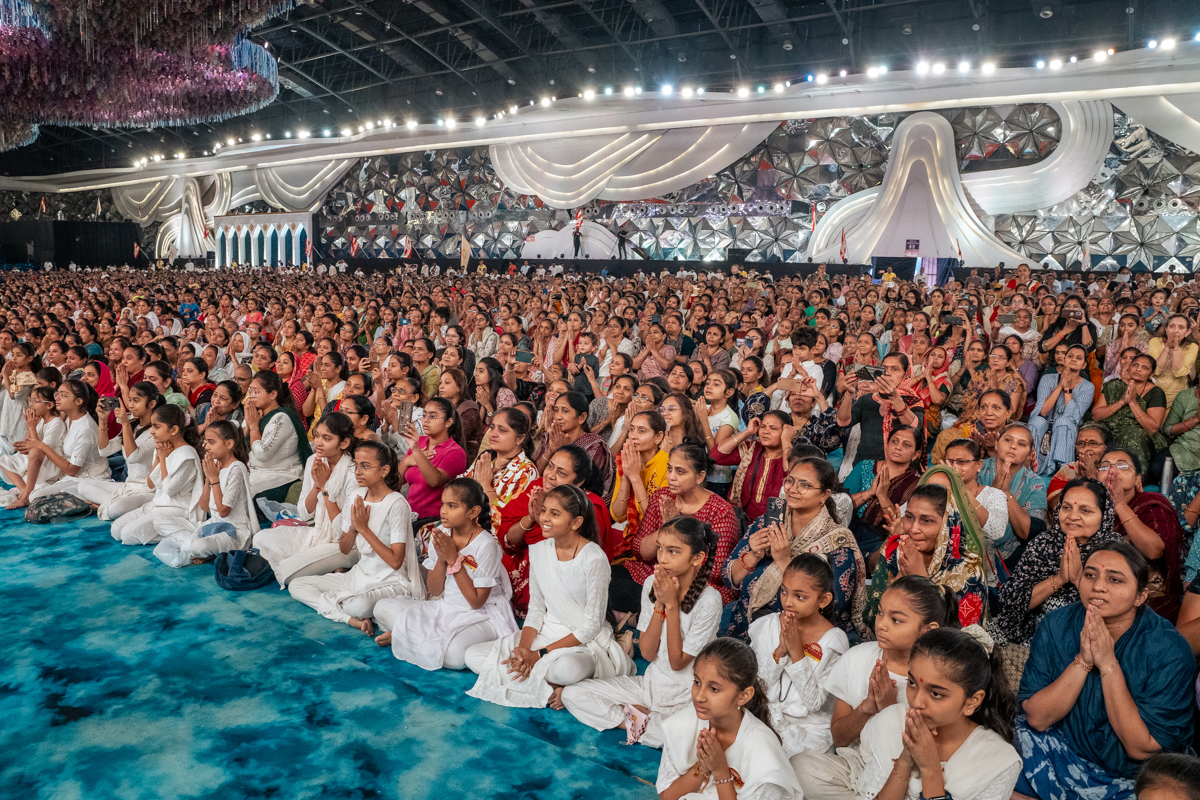 Devotees await Swamishri's arrival at YPD World Convention Center, Surat