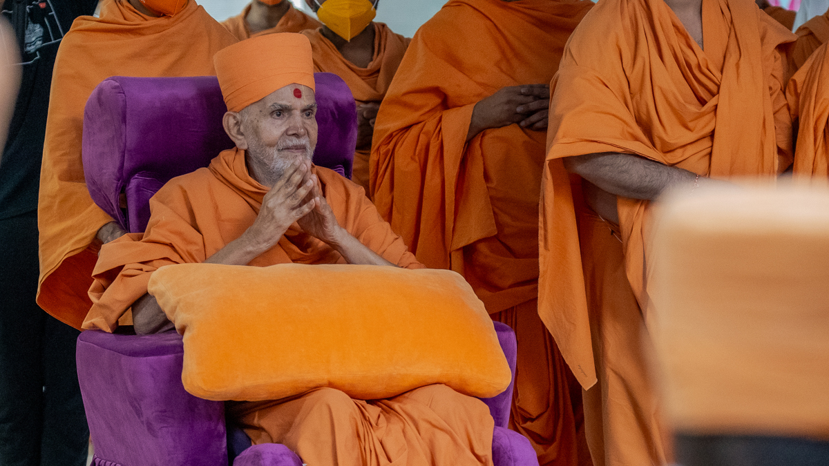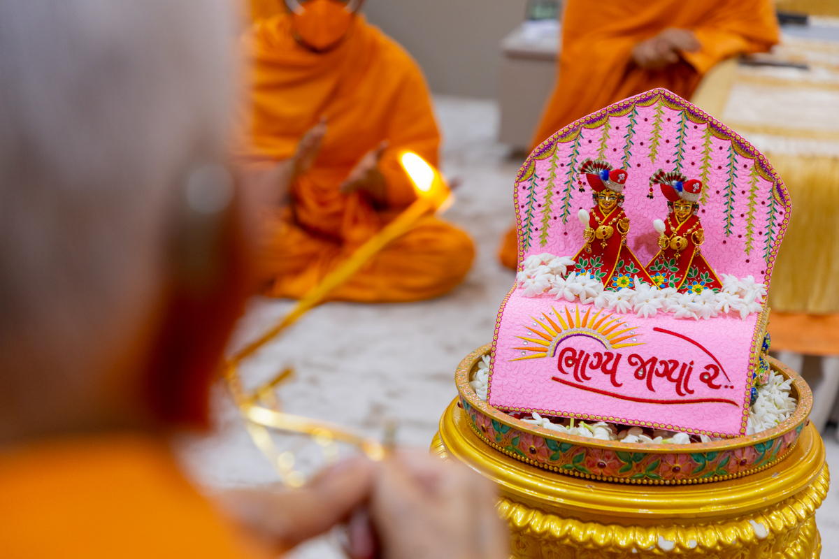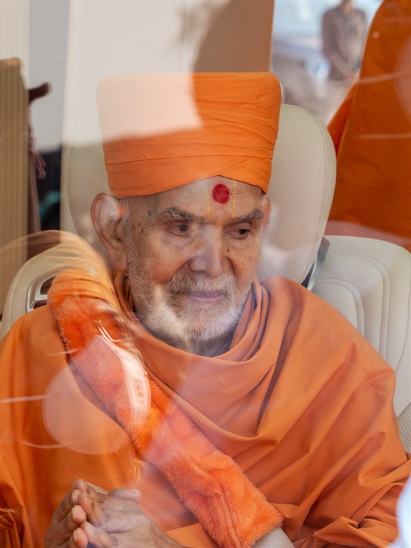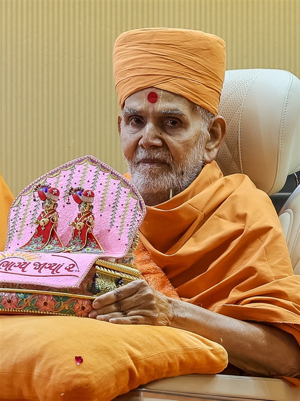 Swamishri doing darshan of Shri Akshar-Purushottam Maharaj and Brahmaswarup Pramukh Swami Maharaj