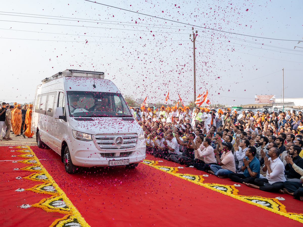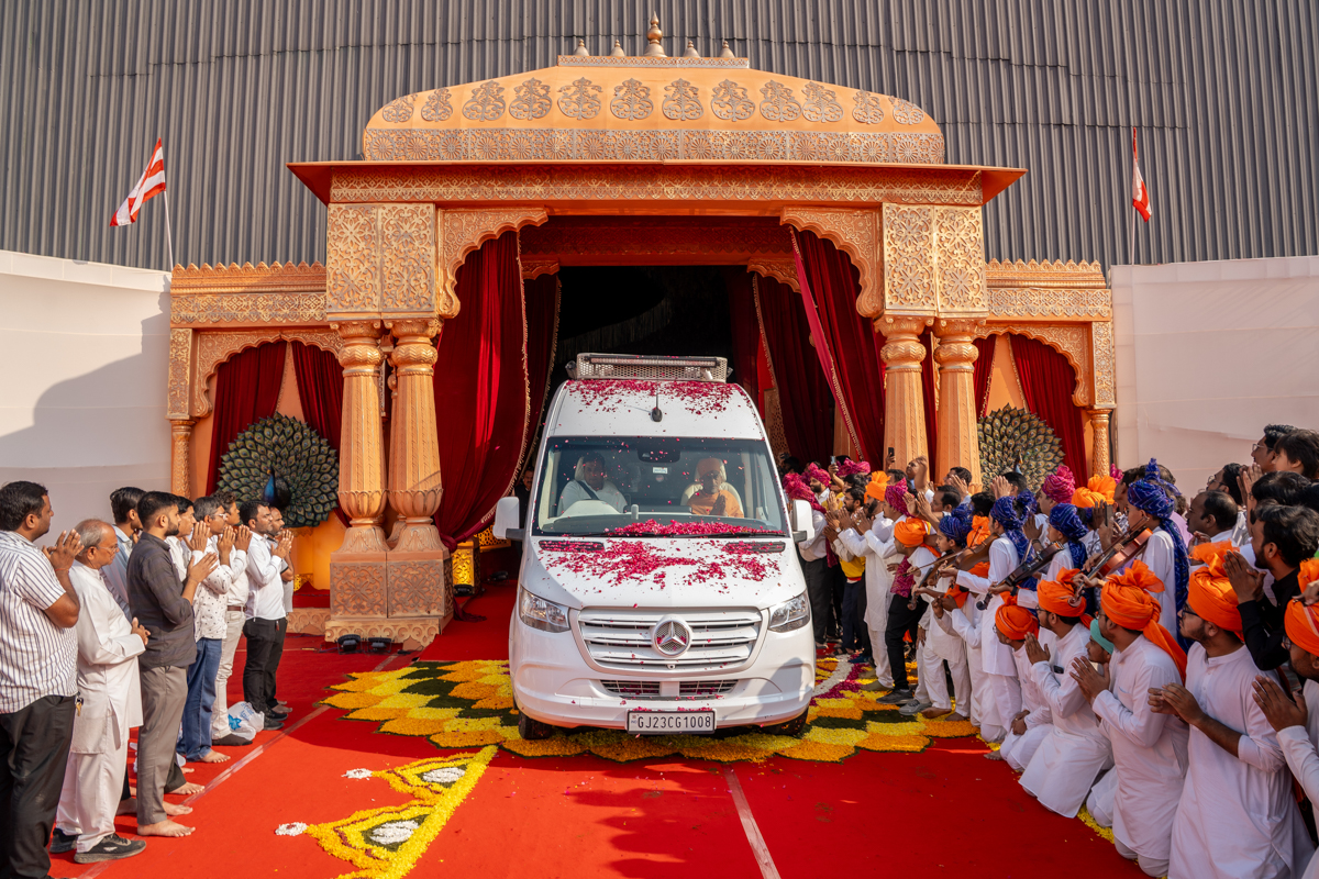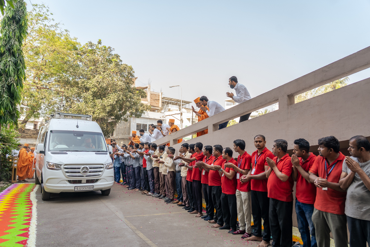 Swamis welcome Param Pujya Mahant Swami Maharaj at Surat International Airport