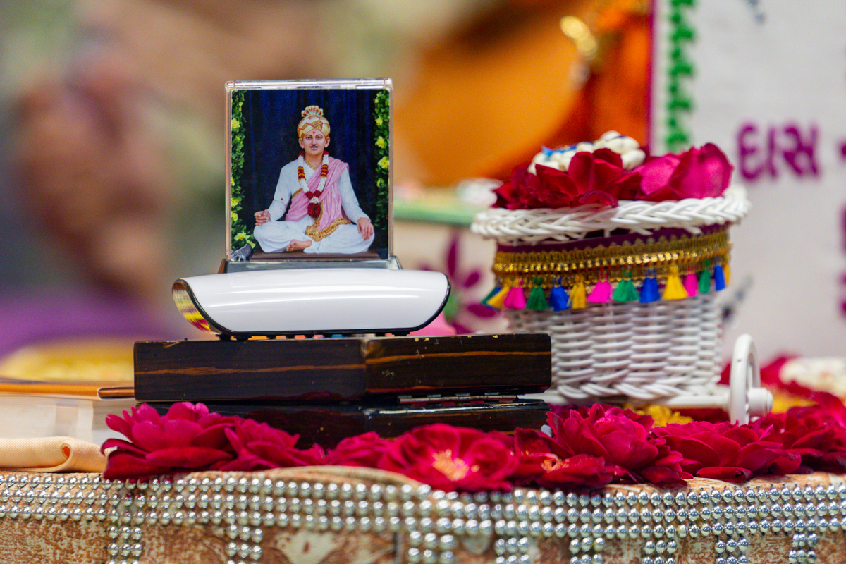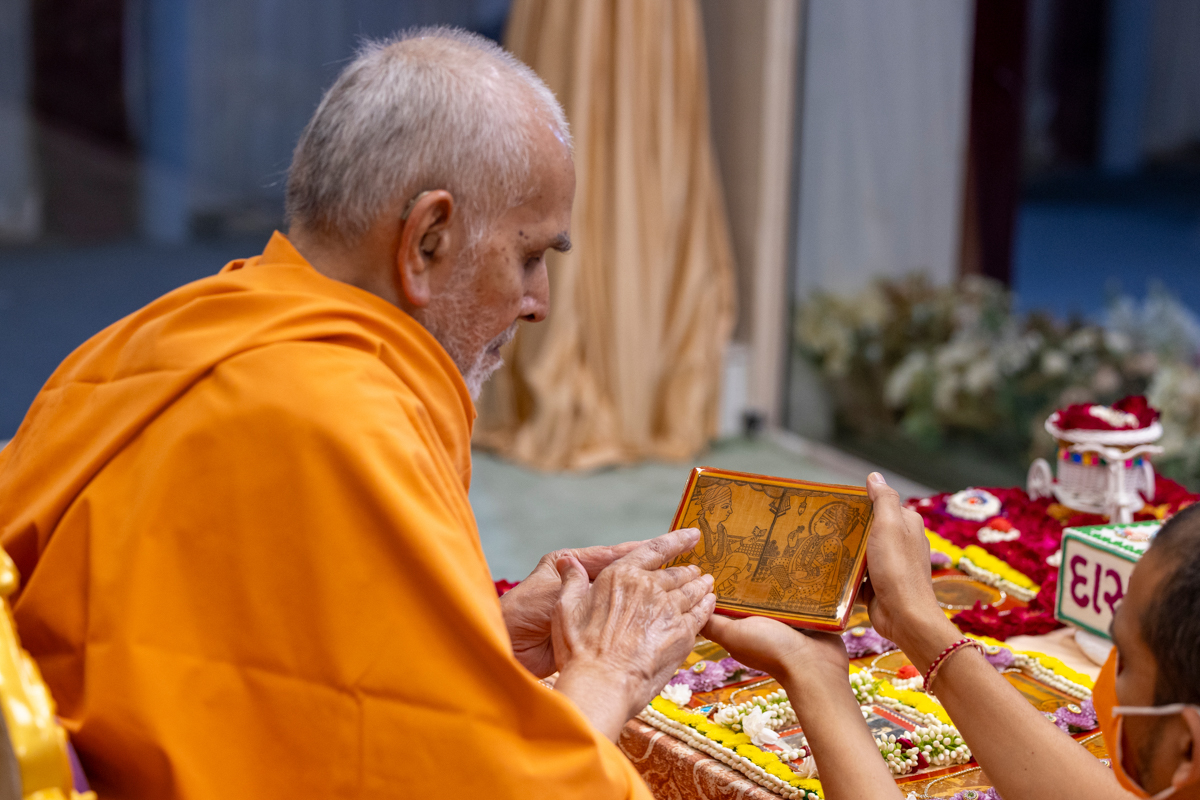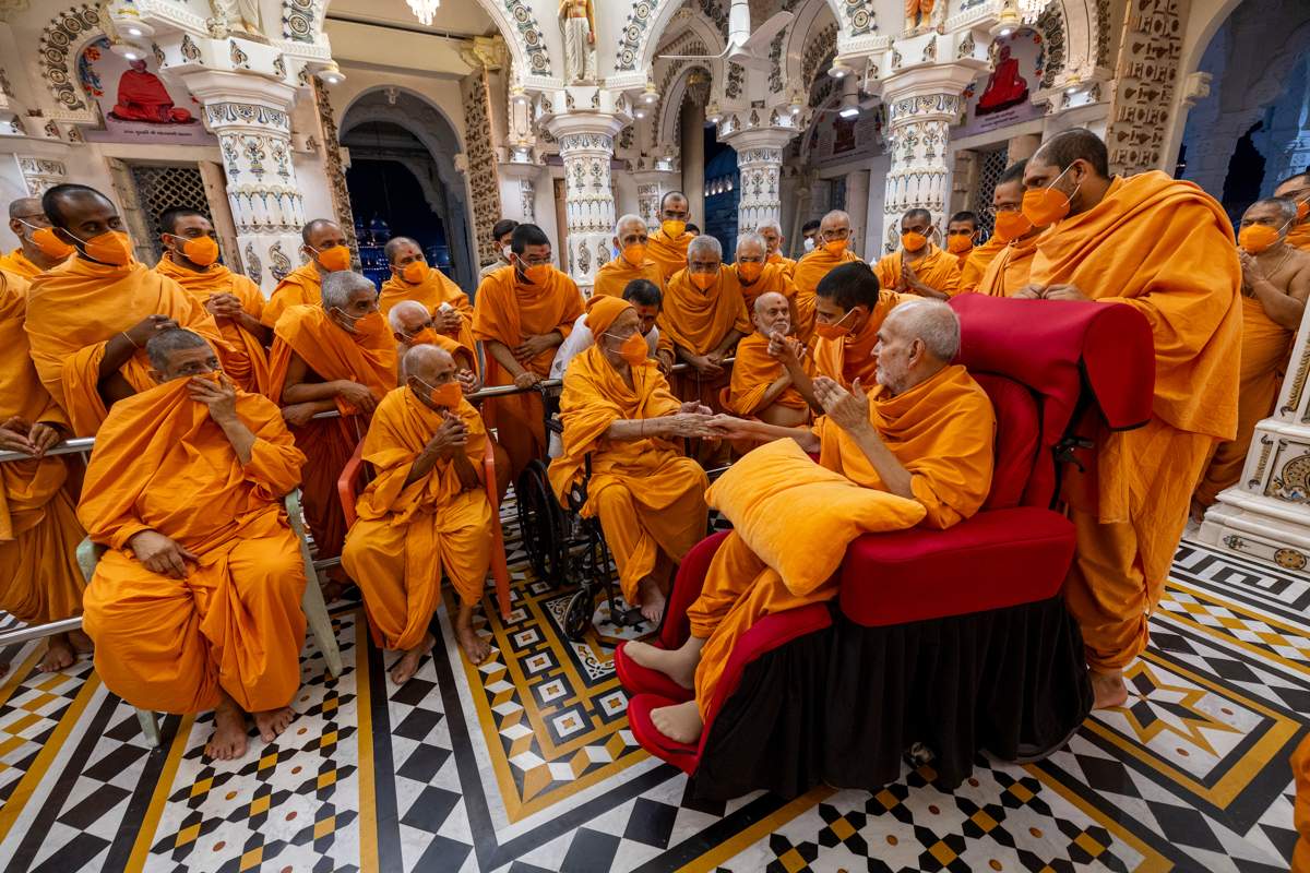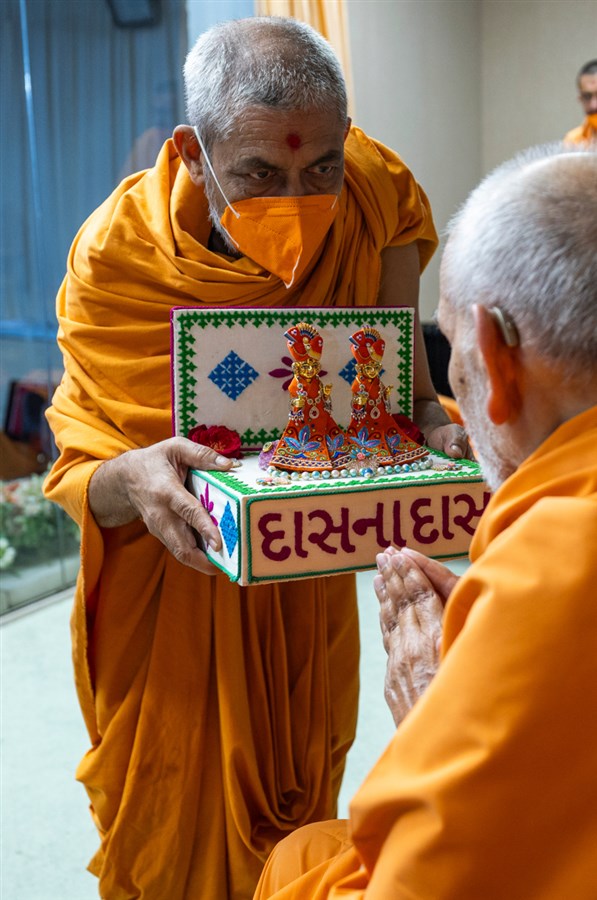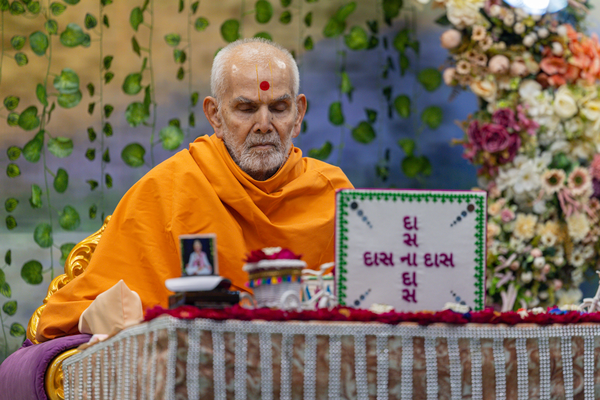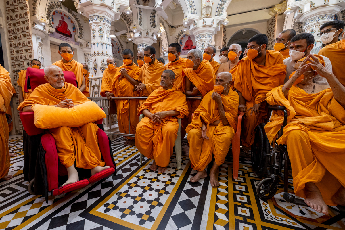 Param Pujya Mahant Swami Maharaj engrossed in darshan of Shri Harikrishna Maharaj and Shri Gunatitanand Swami Maharaj