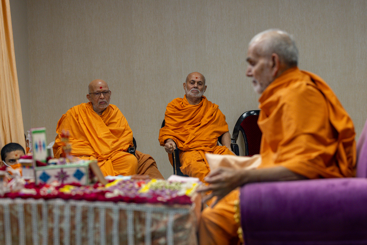 Swamishri engrossed in darshan of Bhagwan Swaminarayan, Aksharbrahma Gunatitanand Swami and Shri Gopalanand Swami