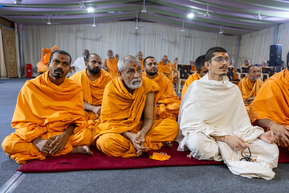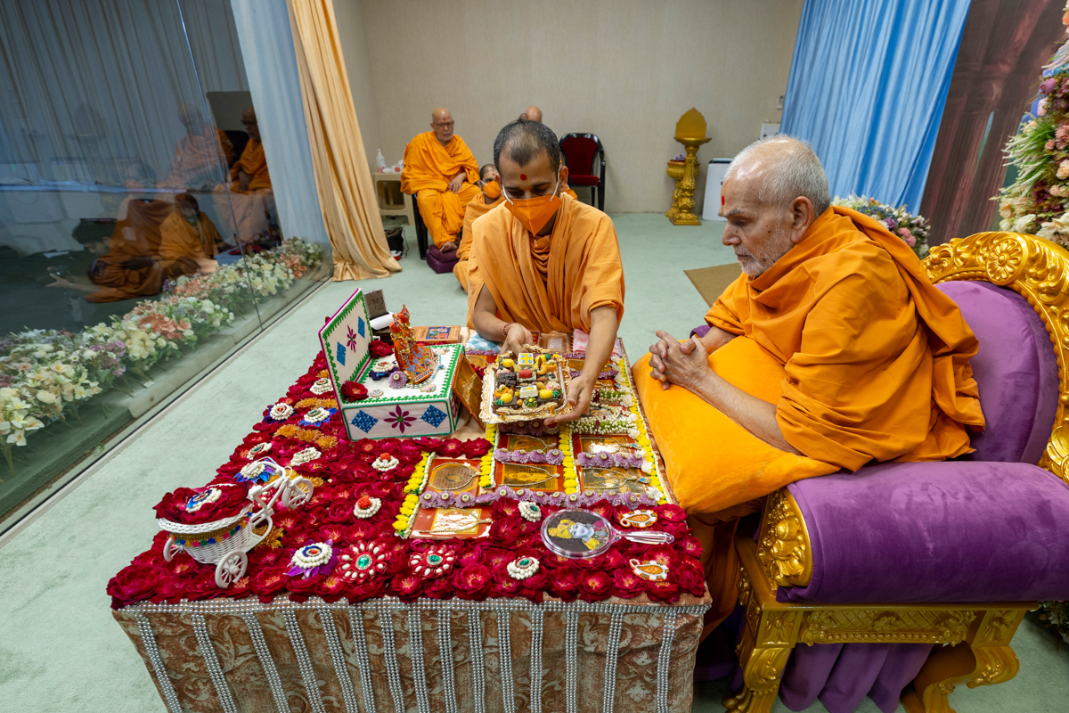 Pujya Ghanshyamcharan Swami and Pujya Viveksagar Swami doing Swamishri's puja darshan