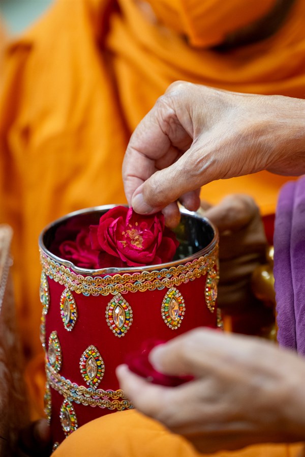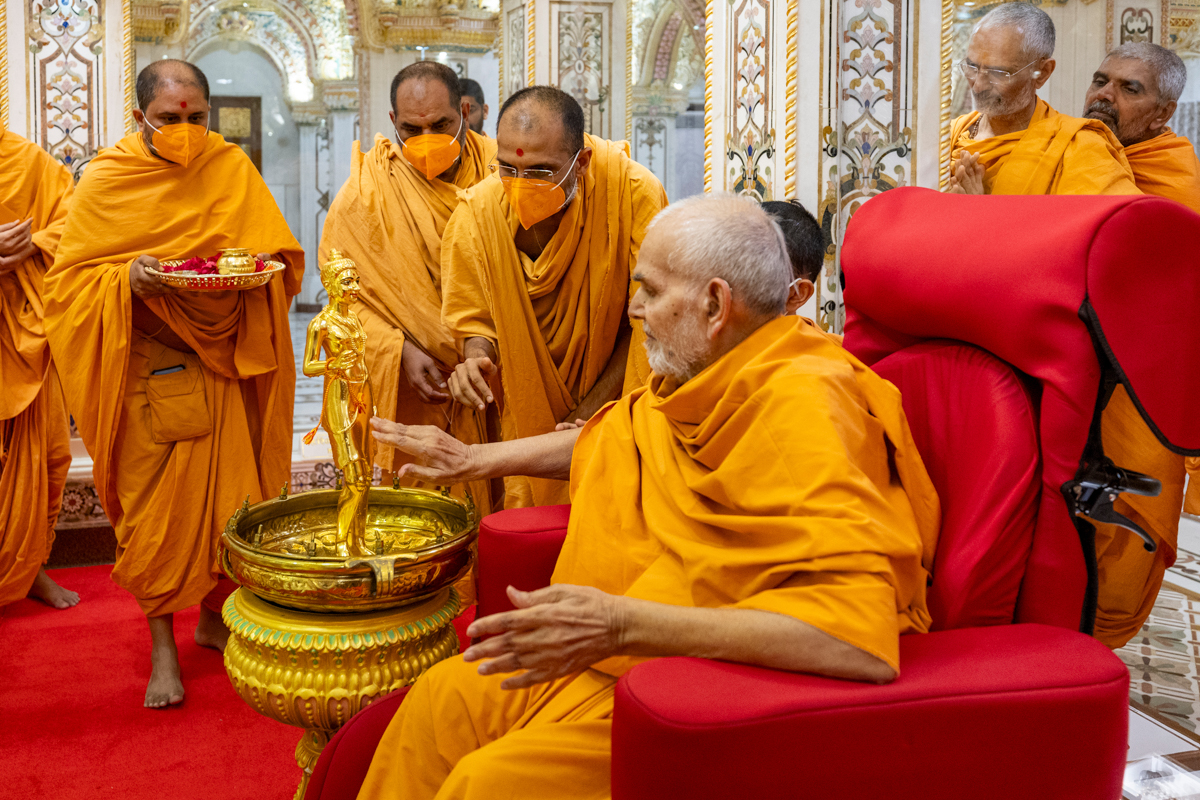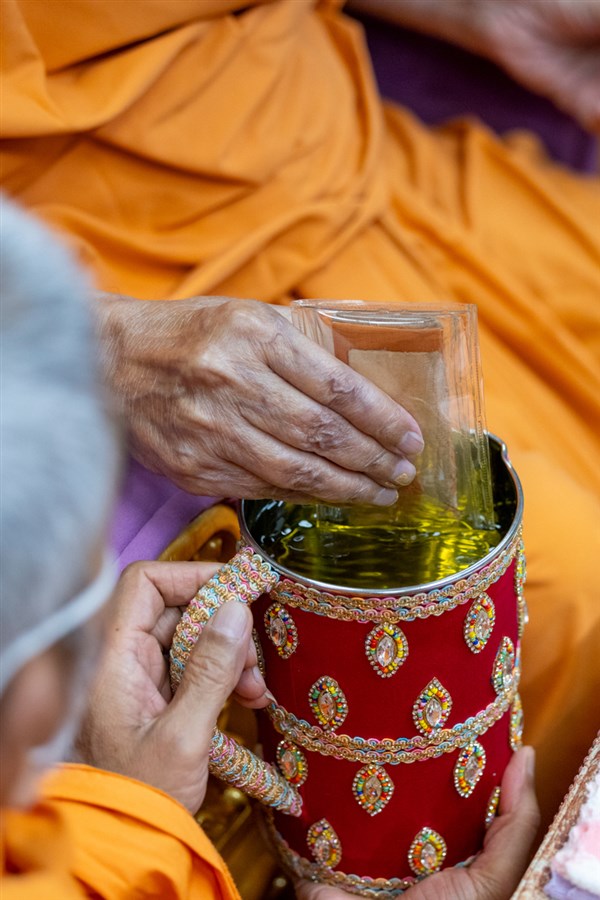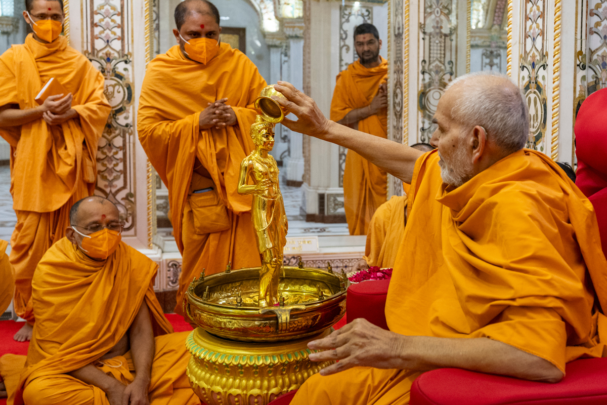 Swamishri sanctifies water with the holy relics of Bhagwan Swaminarayan and the Guru Parampara