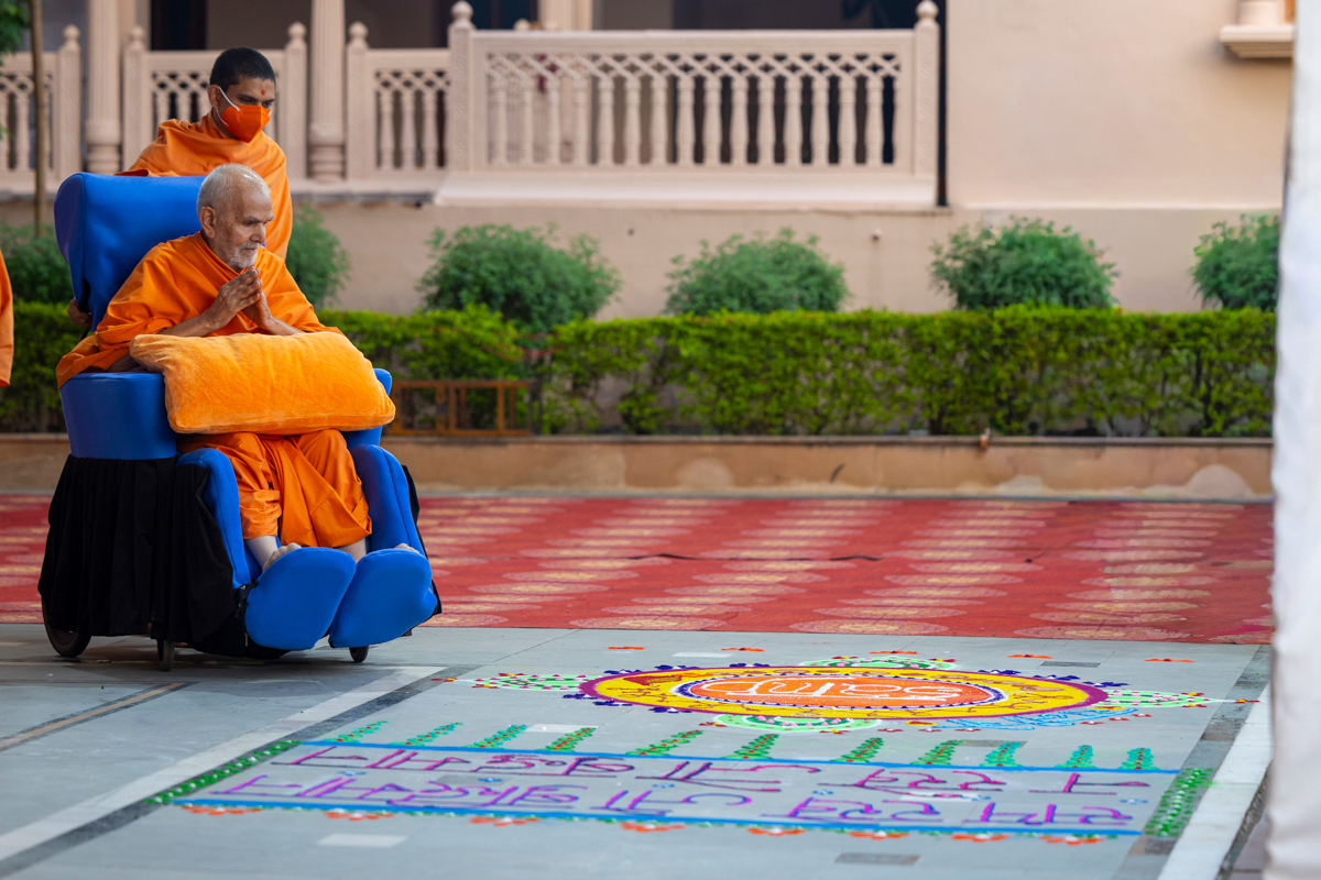 Swamishri observes a rangoli in the mandir campus