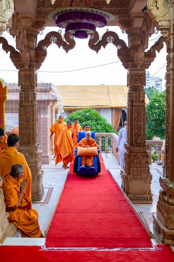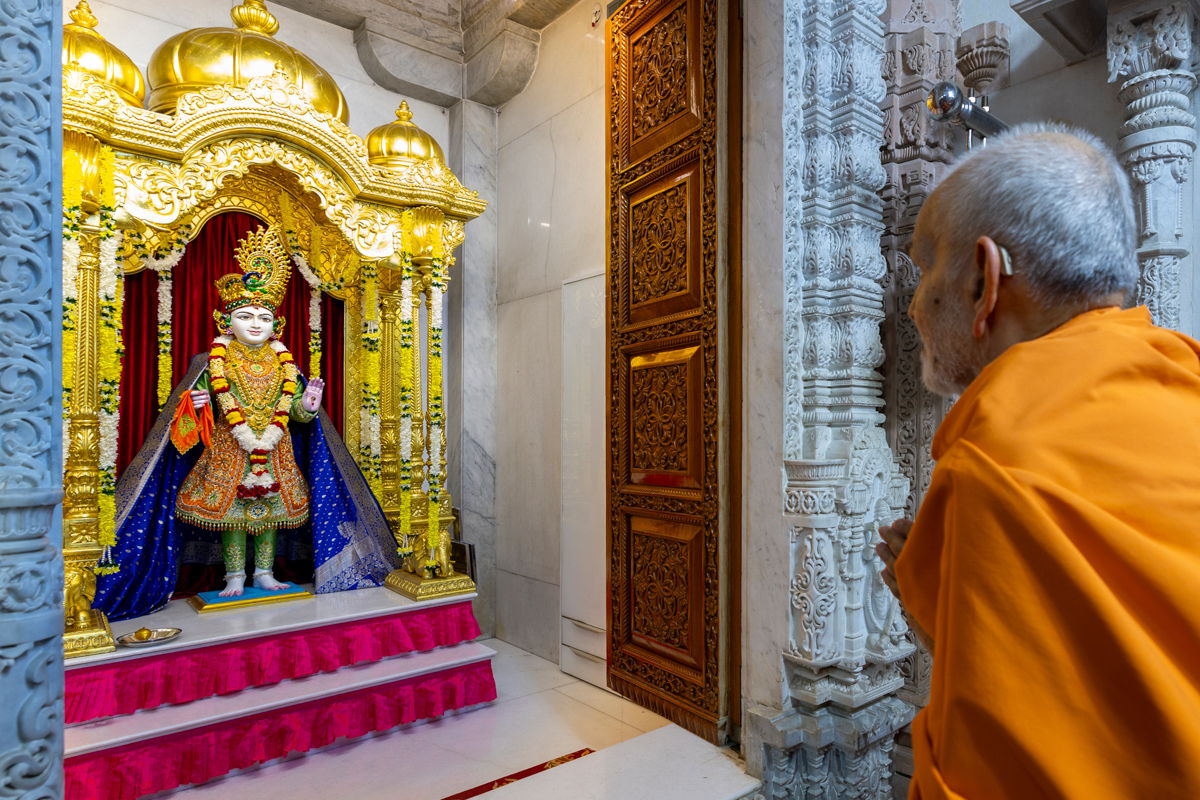 Swamishri arrives for Thakorji's darshan