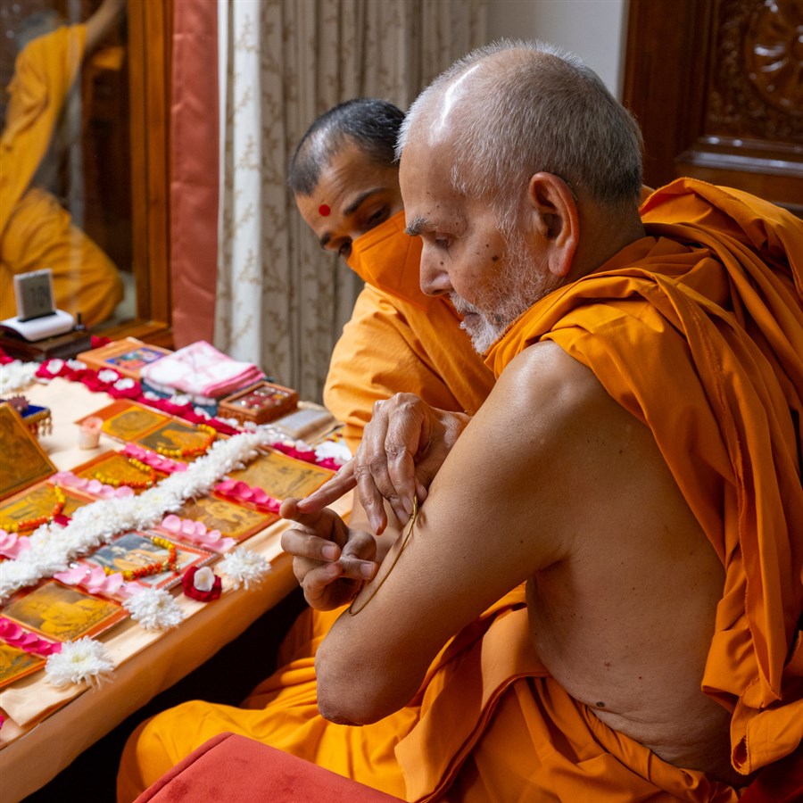 Swamishri applies a tilak on his upper arm
