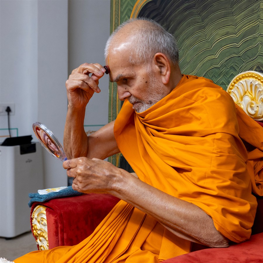 Swamishri applies a chandlo on his forehead