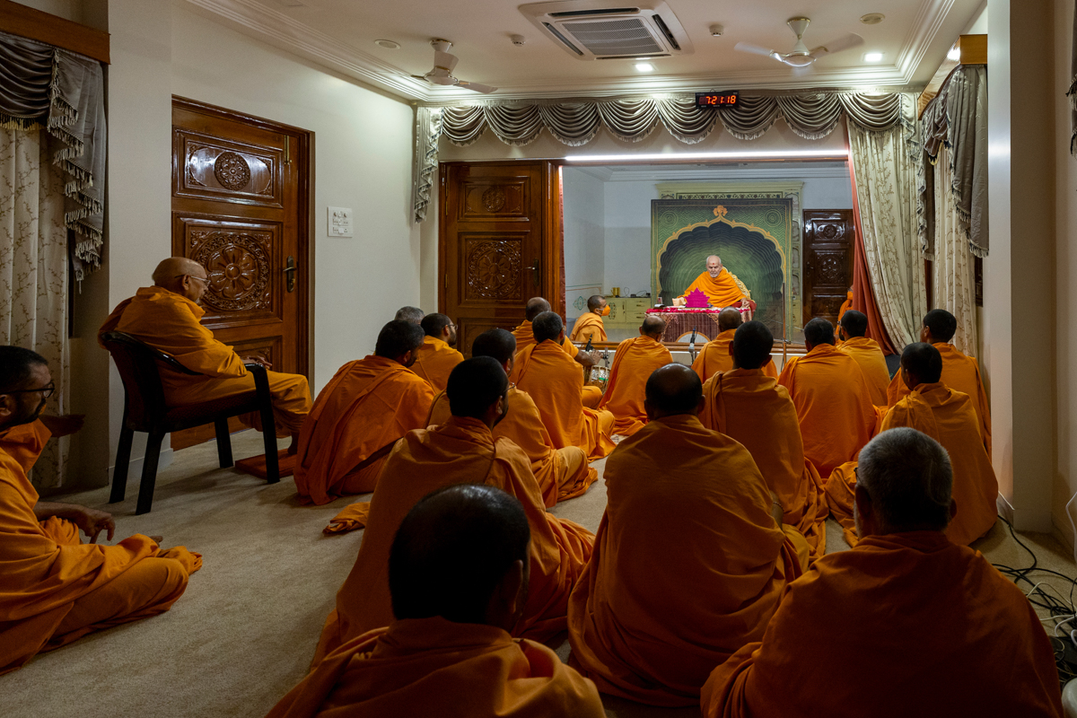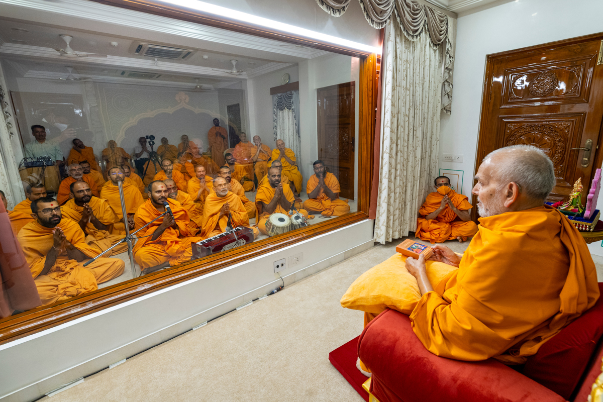 Swamis and devotees doing darshan of Param Pujya Mahant Swami Maharaj