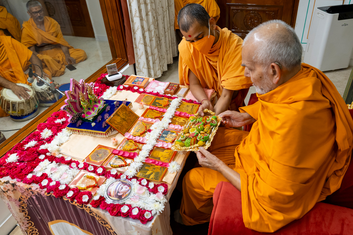 Swamishri offers thal to Brahmaswarup Pramukh Swami Maharaj