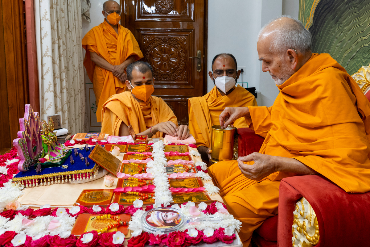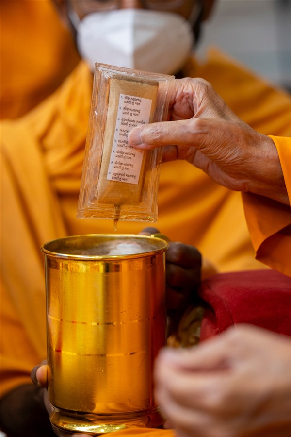 Swamishri sanctifies water with the holy relics of Bhagwan Swaminarayan and the Guru Parampara