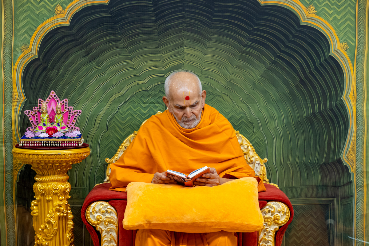 Swamishri turns the mala in his daily puja