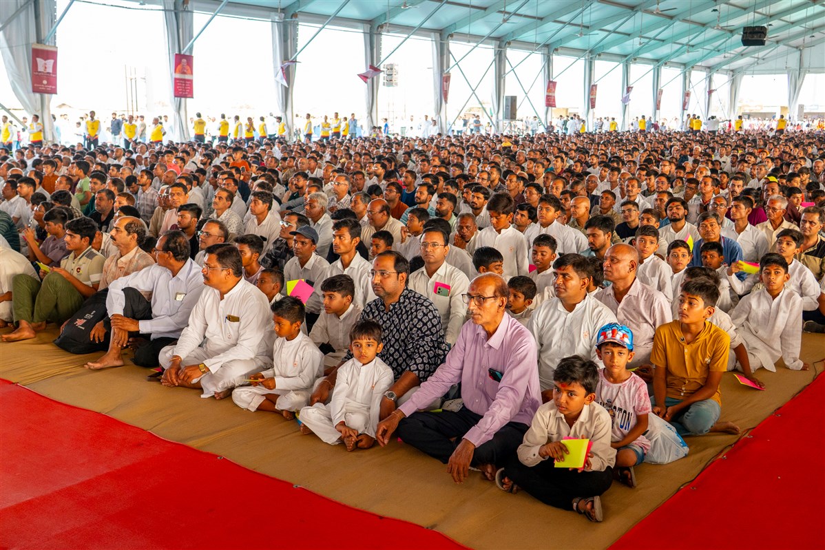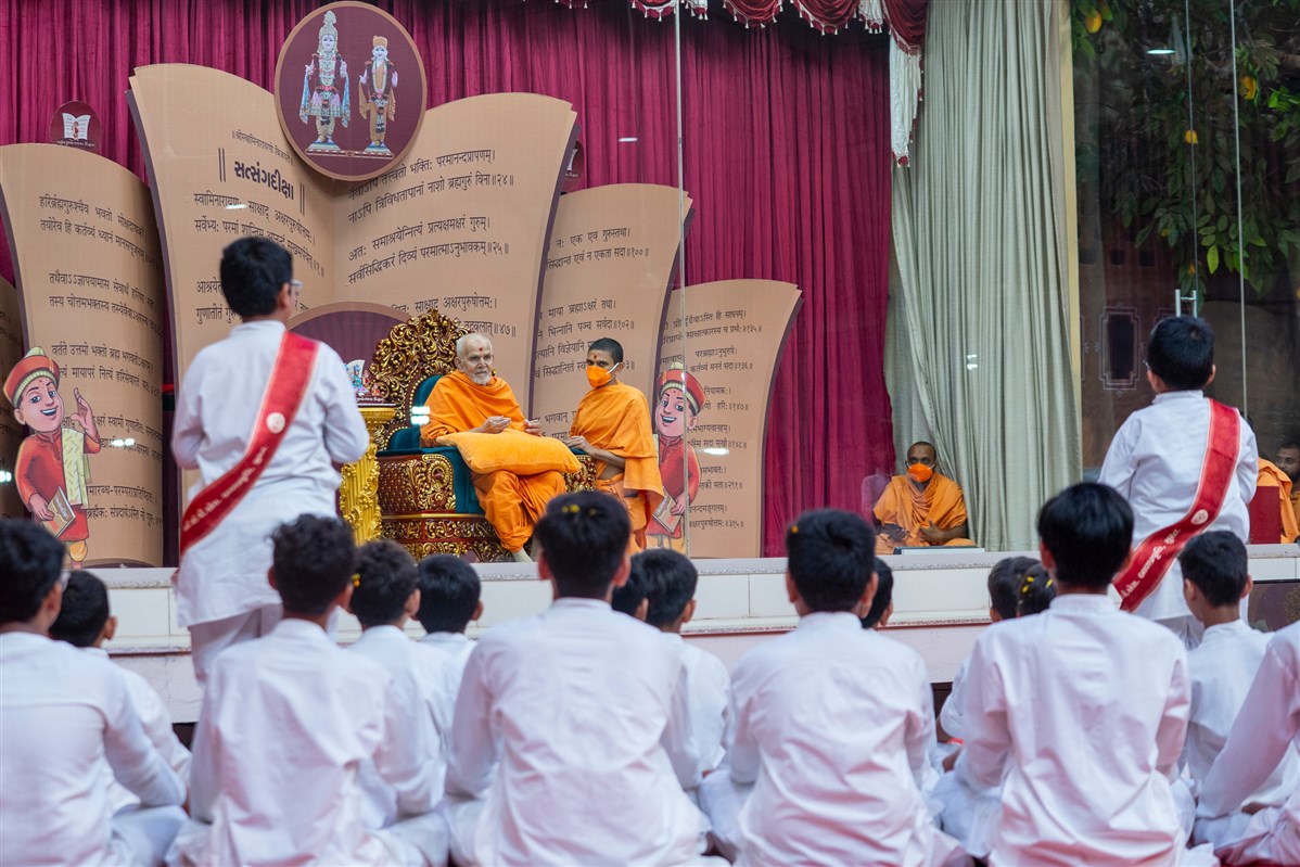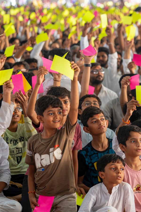 Swamishri observes an invitation card for the evening Bal Din assembly